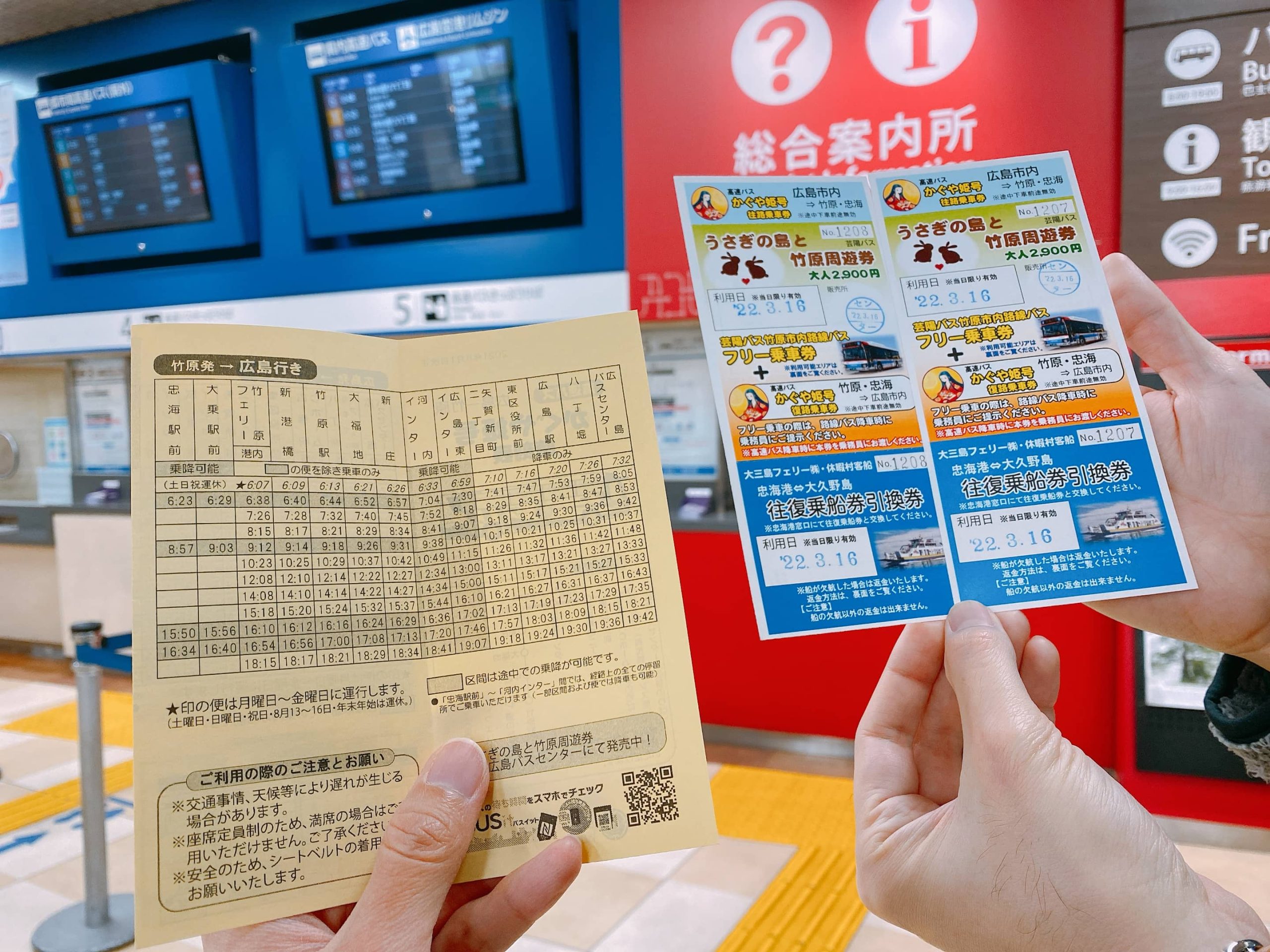 在廣島巴士中心(広島バスセンター)買票時被小姐推銷了便宜的套票,原本巴士來回是3000日幣,船費來回720日幣,總共3720日幣,而這個套票是2900,包來回的巴士和船票的兌換卷。(另外也可無限搭乘竹原市內公車,不過我們想在兔子島待久一點就沒利用了~)