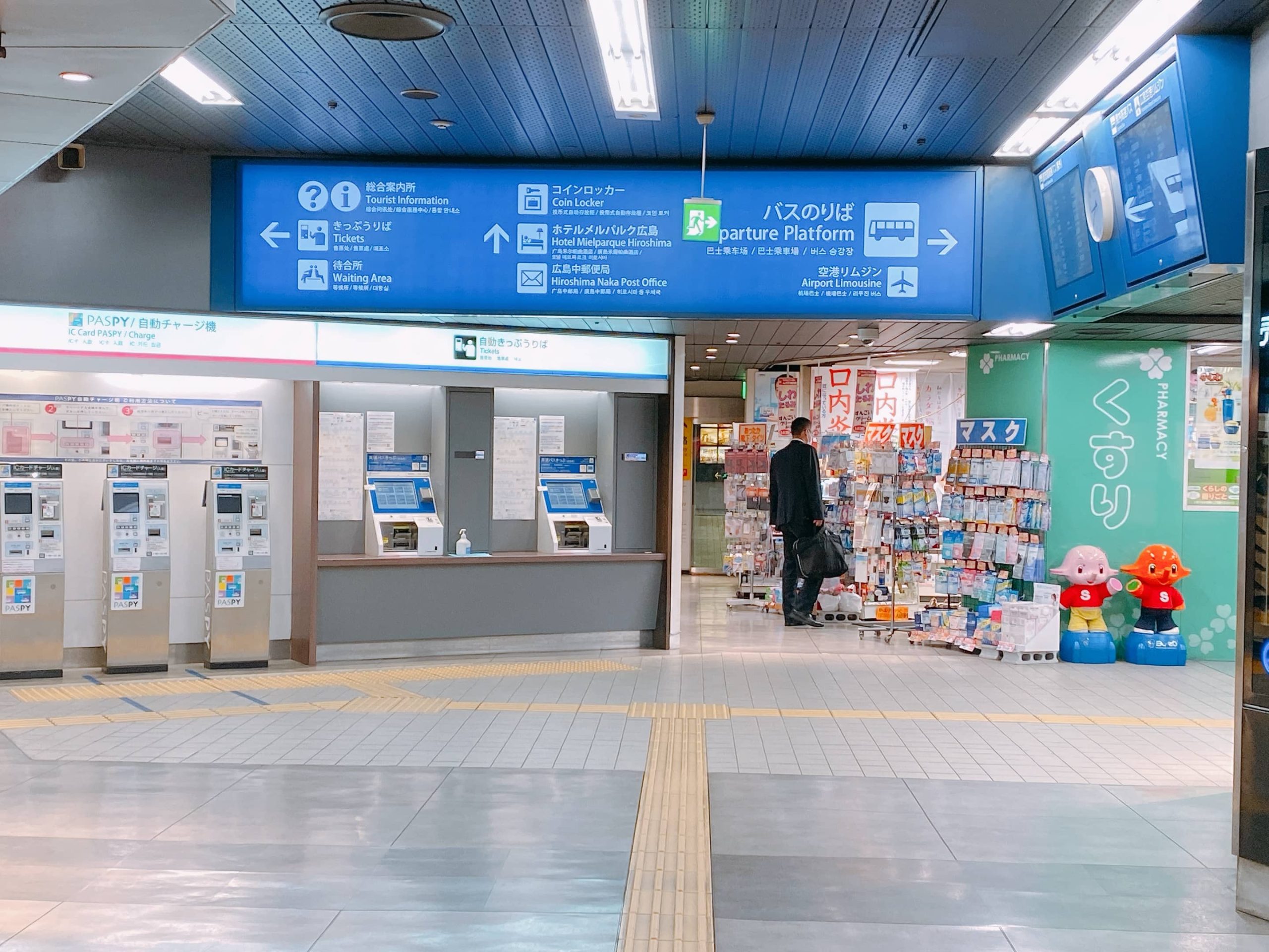 網路大部分的遊記是搭乘JR到「忠海駅」,而我們的旅館在廣島巴士中心(広島バスセンター)附近,所以選擇搭芸陽バス「かぐや姫号」高速巴士。廣島巴士中心的位置有點難找,總之先跟著GOOGLE地圖走會看到手扶梯,搭上樓後跟著指示牌,就能看到下面照片的樣子。左轉是售票處,右轉是乘車處。