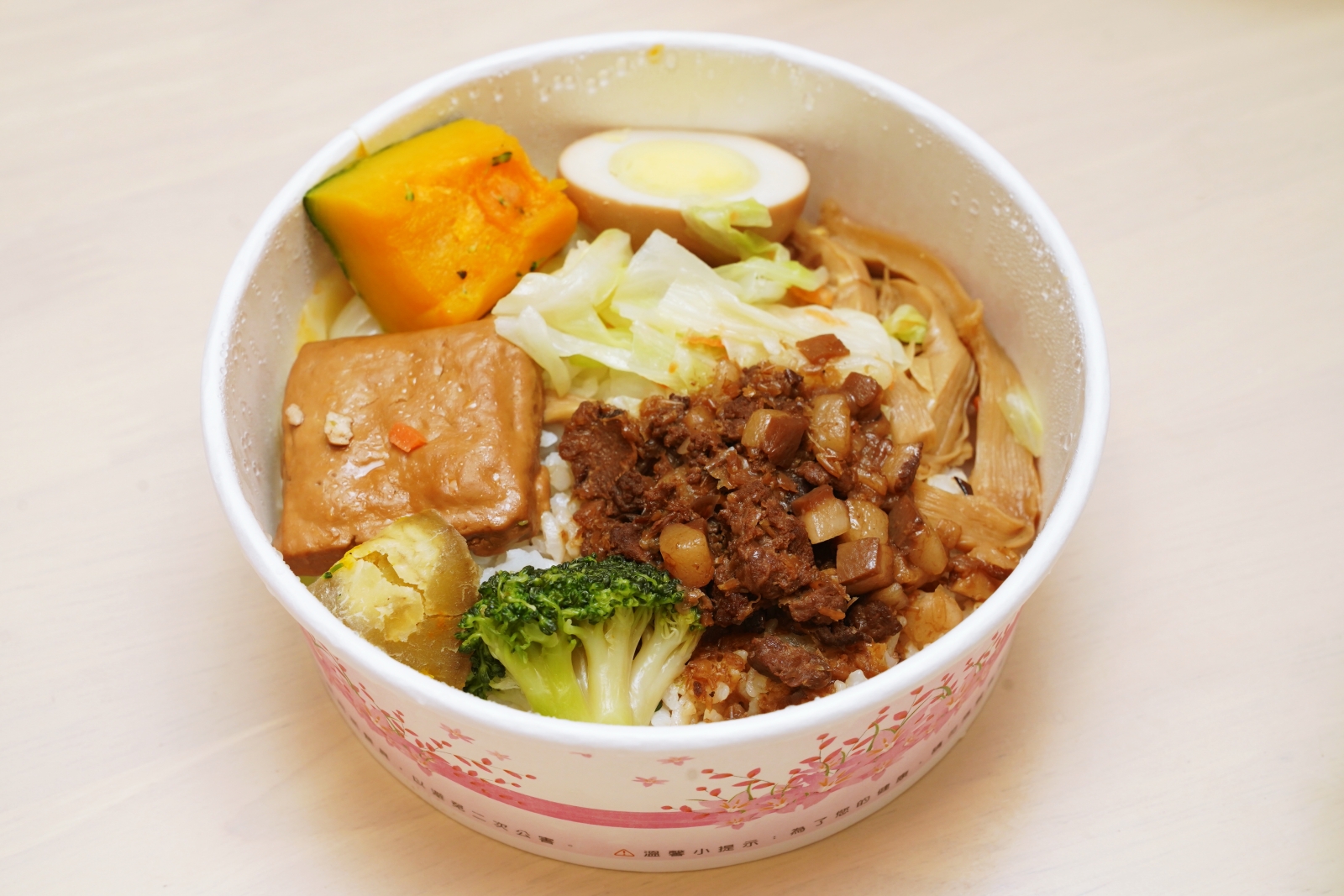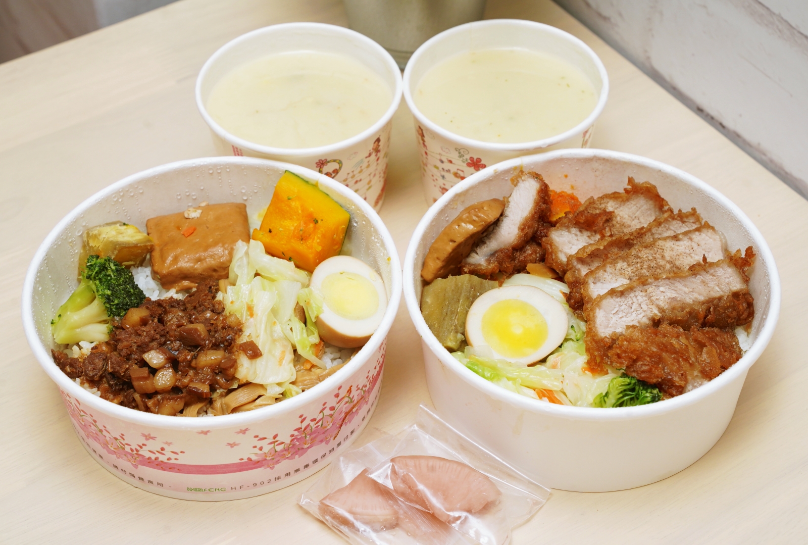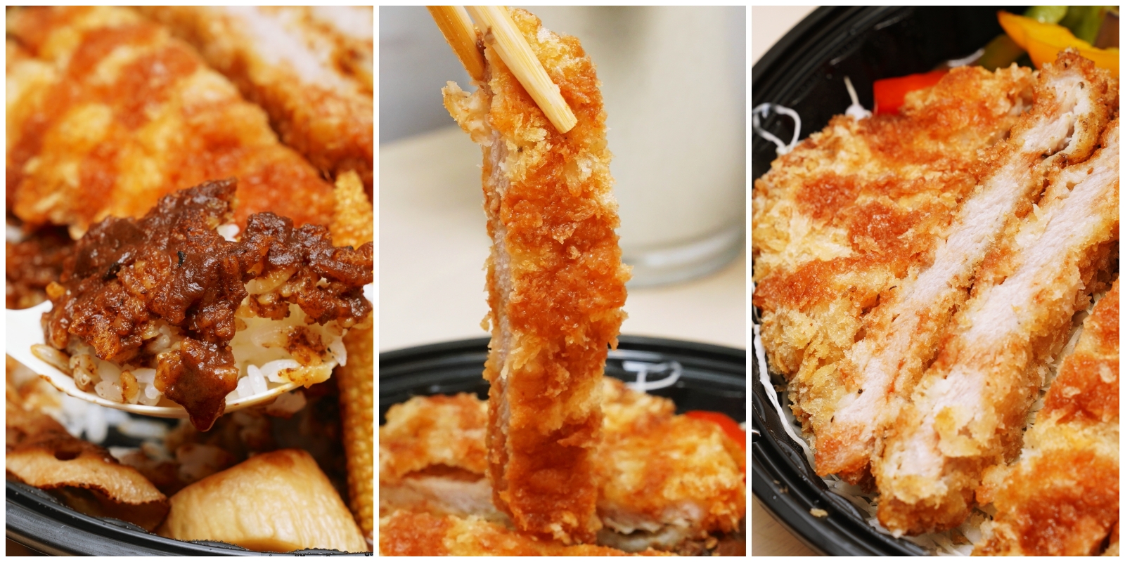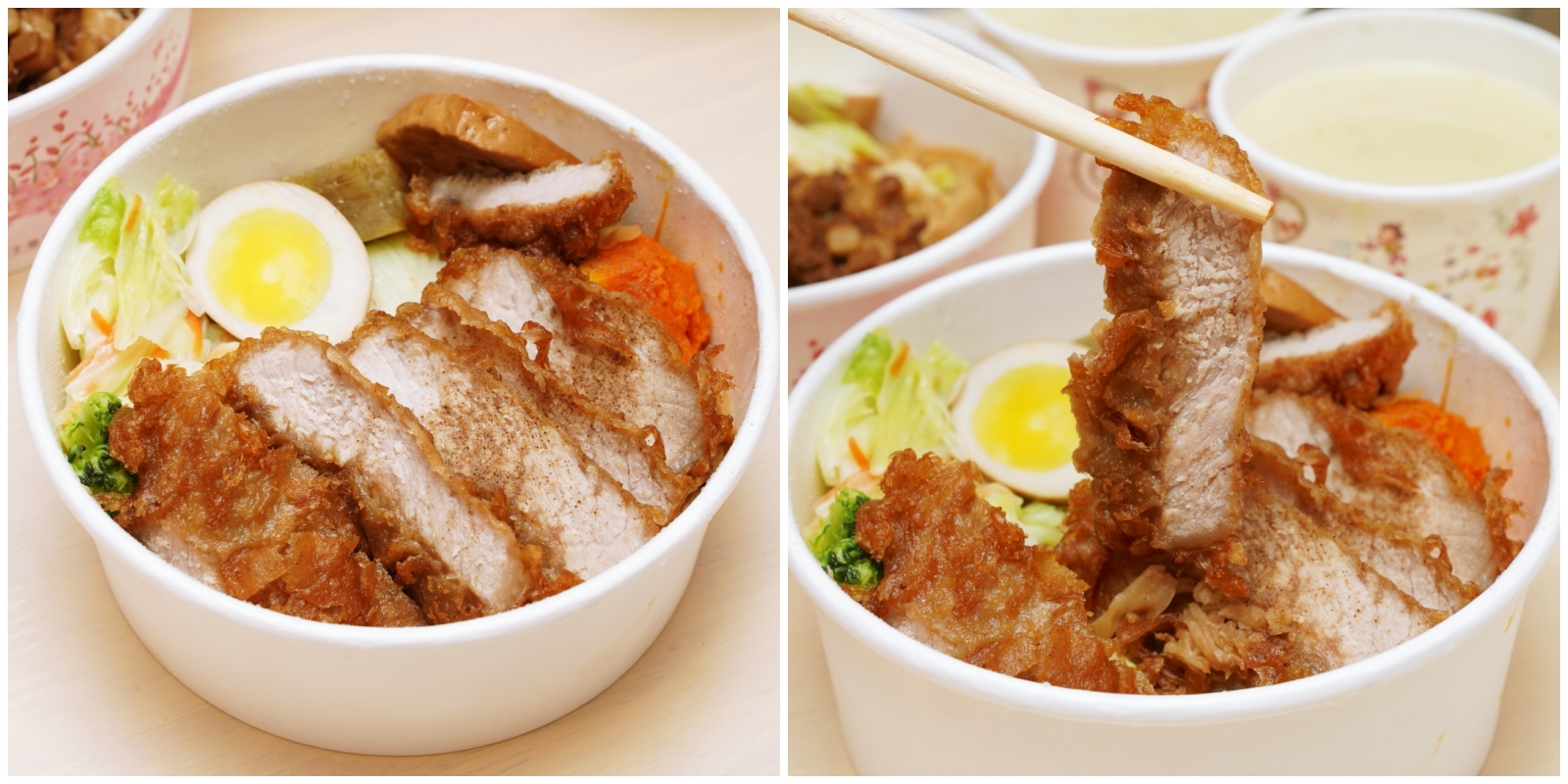 香嫩炸豬排便當是用臺東的豬里肌肉,經由斷筋碾壓、醃漬處理,表皮脆,肉質香嫩不柴。兩種飯的配菜放了南瓜、地瓜、蔬菜,非一般自助餐的大鍋菜油膩菜色,是很均衡的搭配。