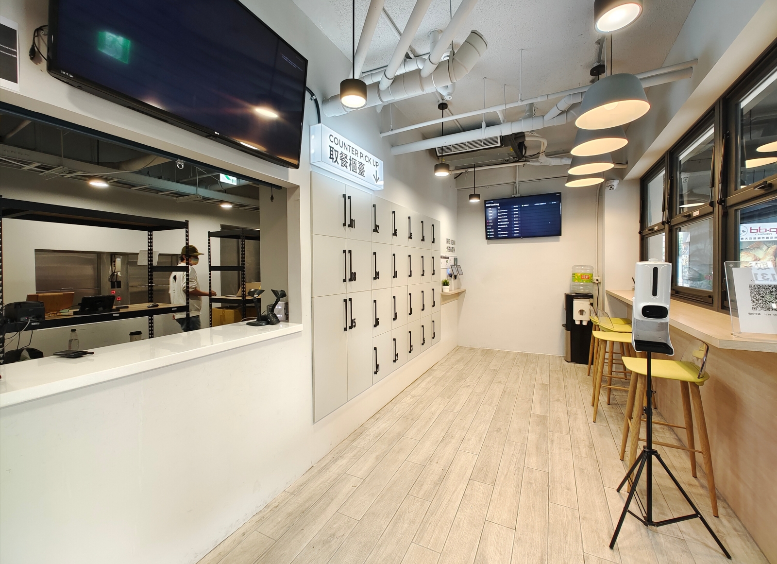 KitchenNow 雲端廚房在門面設計上就已經預先做好分流,取餐的餐點櫃檯、休憩區明確劃分,人潮不會往同一處湧入。無論是外送員或自行點單、自取的客人,都是統一在「取餐處」領取餐點。