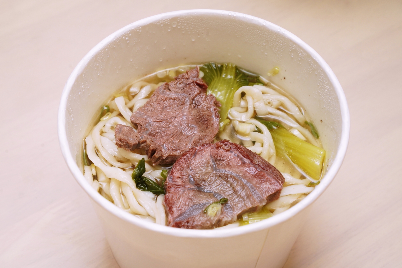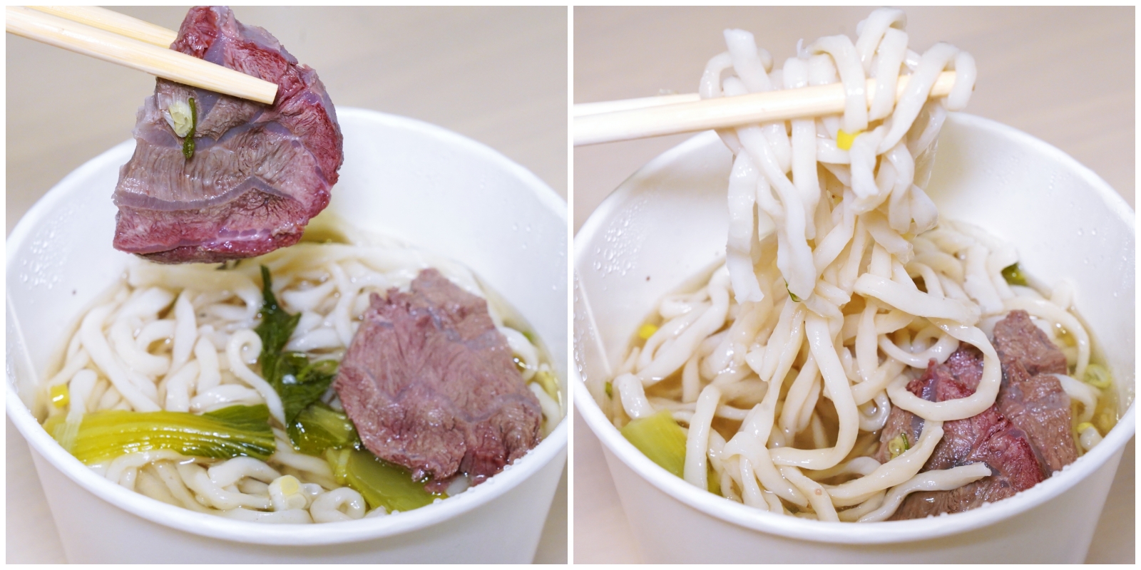 清燉牛肉麵湯頭是用蔬果和牛腱、牛肋條等部位,熬煮長達 12 小時,湯頭內濃縮牛肉脂香、湯頭的輕纖感。牛肉塊的部位是帶有嫩筋的牛腱心與帶有油脂的牛肋條,小火慢燉避免過熟過老,同時保持柔軟細緻的粉色色澤,麵條是台式拉麵,不是一泡就爛的那種,在食材與包材包裝的控管,都能讓消費者把握黃金時間品嘗。