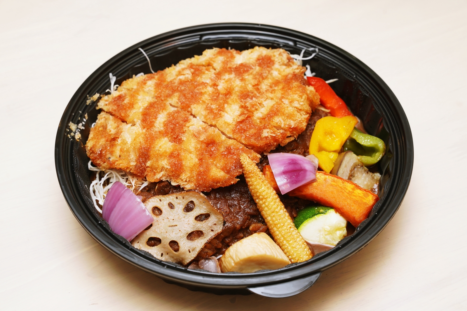 配有蔬菜的「炸豬排蔬菜咖哩飯」內含金澤冠軍咖哩飯、炸豬排、還有隨季節調整的五到八種蔬菜,顏色搭配得亮麗,豬排香脆不油膩,辛香咖哩有香料的精華還有點微辣,份量夠兩個人享用。