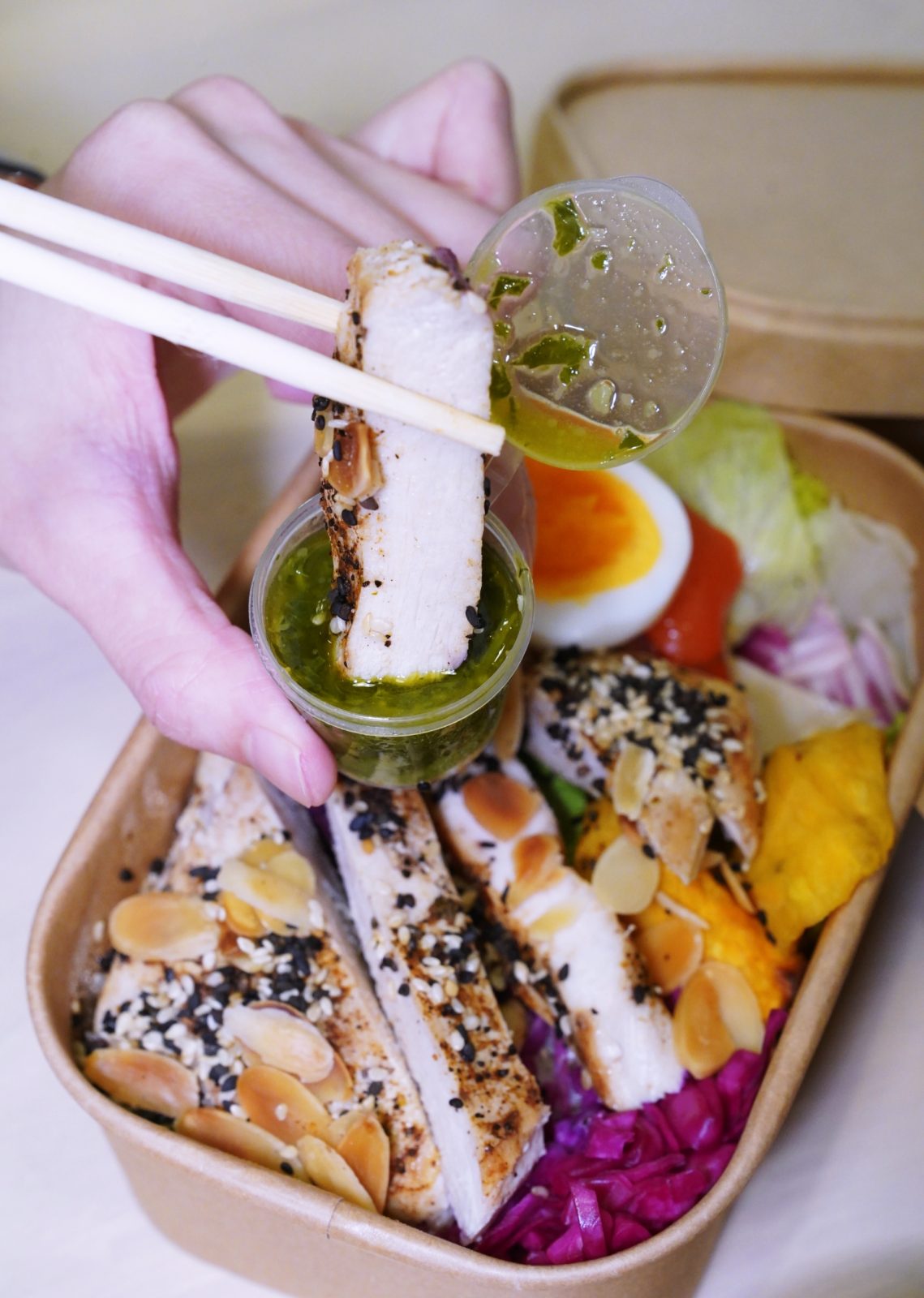 嫩煎舒肥雞胸肉單吃很香,沾羅勒青醬酒醋更促進食慾,有點像橄欖油+巴薩米可醋的味道,蠻合我的口味。基底、配菜可加點,有三種醬汁可選。