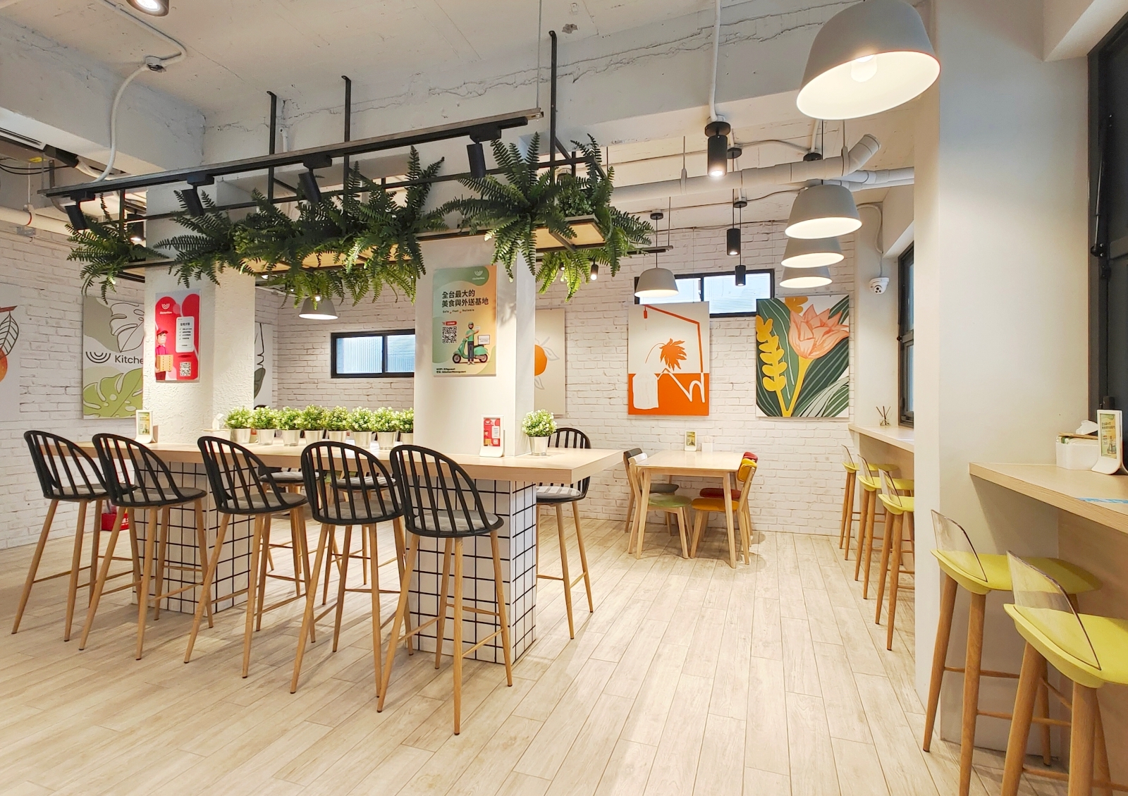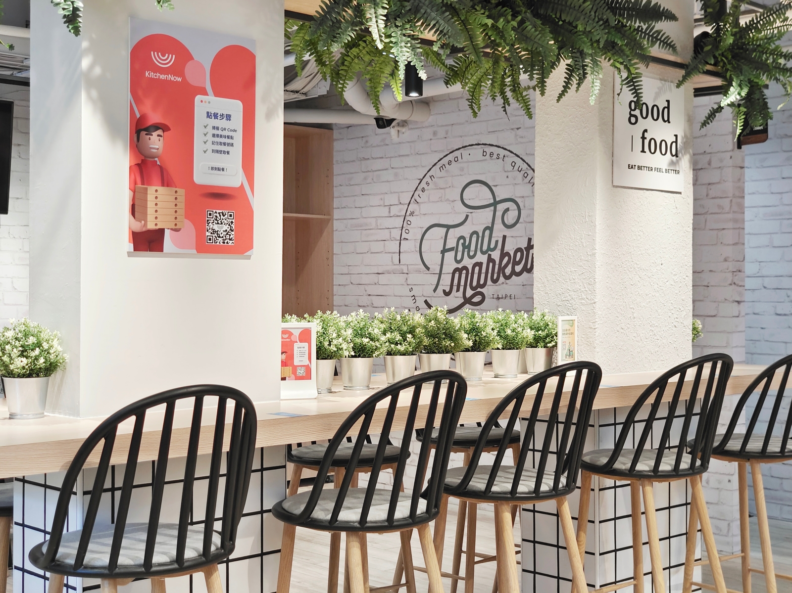 KitchenNow 雲端廚房信義通化店近信義安和站與通化夜市,一樓是外帶、外送的餐點櫃檯(取餐區)與休憩區,出餐的餐點都是從樓上各餐飲品牌店家的廚房製作出來的。