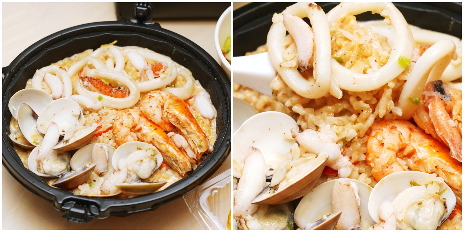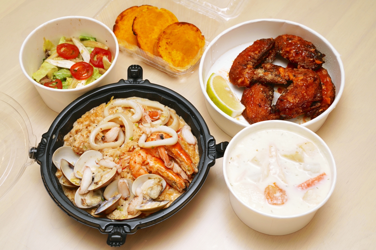 餐點品項有:主餐古月奶油海鮮燉飯 + C 套餐 內含(奶油海鮮濃湯/法式脆皮栗子南瓜麵包/甜酒釀沙拉/水牛城辣雞翅),光是古月奶油海鮮燉飯的份量就不少,奶油海鮮濃湯也是滿滿的料,整個套餐足夠兩個人享用。