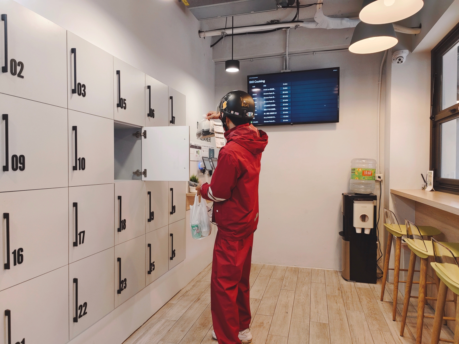 在動線上的標示非常明確。外送員接到、製作完成的訂單都會放在餐櫃,視覺上整齊不雜亂。