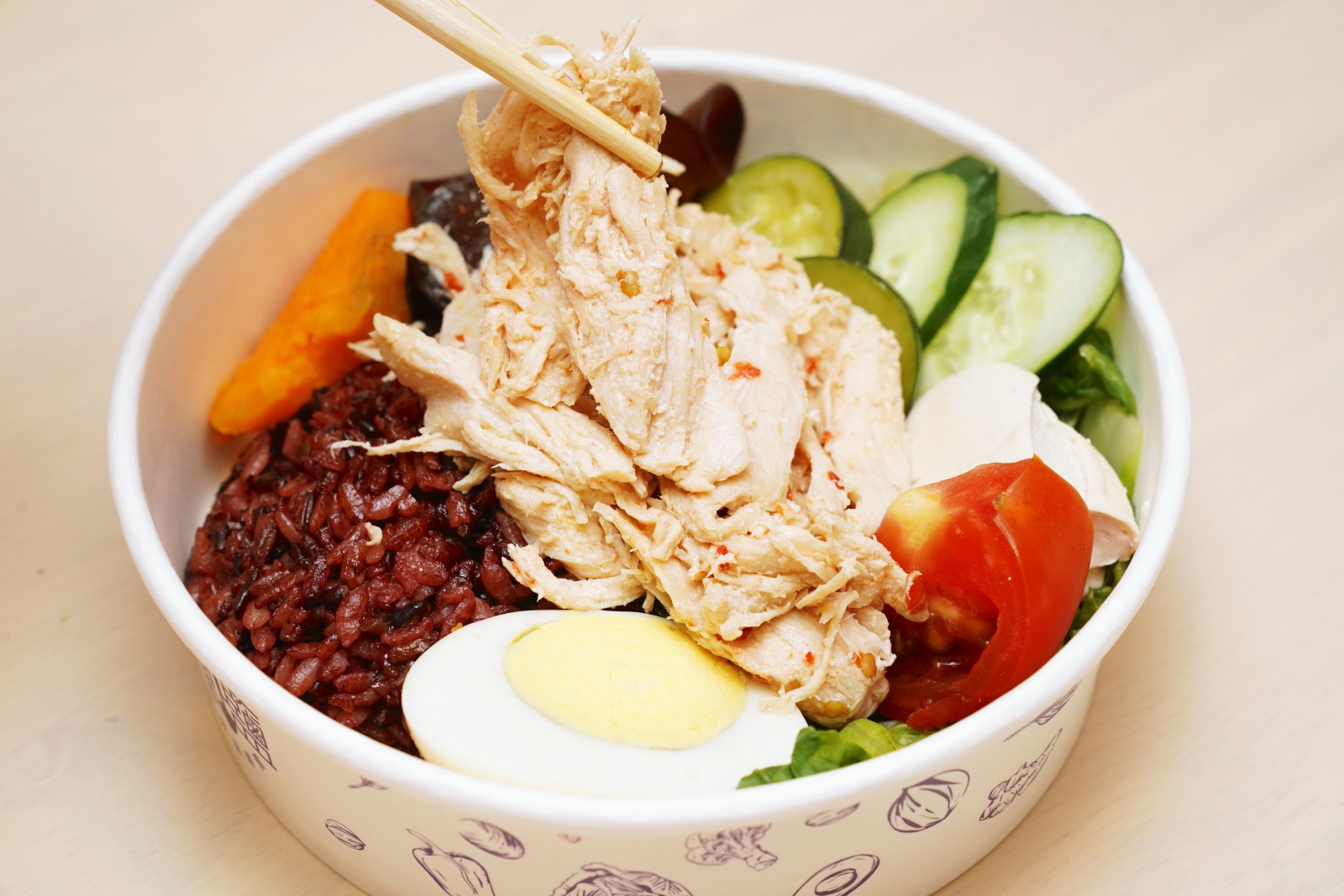 舒肥雞胸低 GI 能量餐盒主菜是嫩煎舒肥雞胸肉,配菜有生菜、酪梨、豆腐、綿密、甜度高的烤紅心地瓜,還有毛豆、枸杞、季節蔬菜、水煮蛋,都是很養生的食材,配上糙米飯更有飽足感,食材豐富,便當拿起來也有一定的重量。