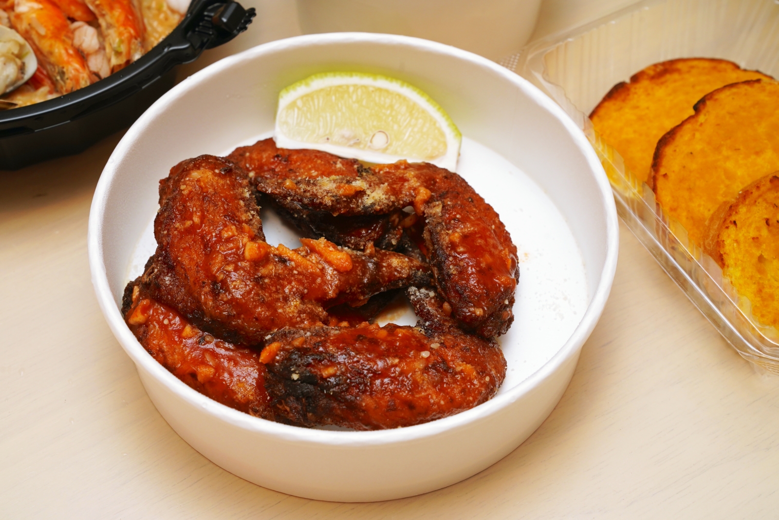 水牛城辣雞翅有二節翅 6 隻,香辣帶勁且偏酸,很能刺激唾液分泌又醒胃,嗑完之後,辣椒氣味還會留在口腔內一陣子,適合來杯氣泡水搭配!