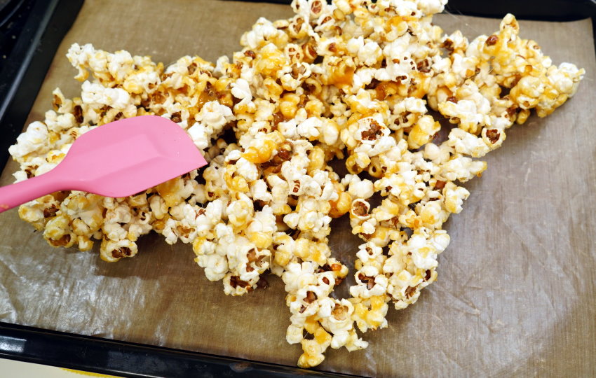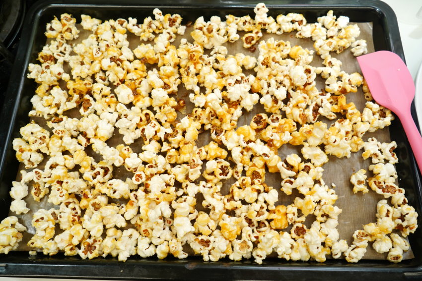4.將裹好焦糖漿的爆米花鋪平晾乾後就可以享用啦! (記得要放平不要黏在一起喔! 否則冷了會變成整團)