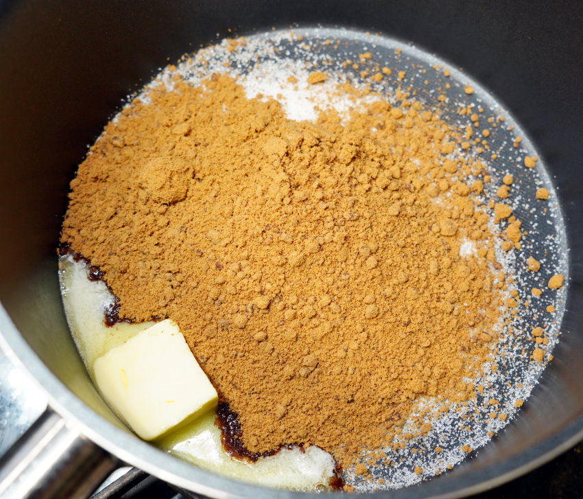 3.另外準備一個鍋子,加入無鹽奶油、砂糖(黑糖口味就是一半砂糖一半黑糖),開小火邊攪拌,等到糖漿變濃稠液狀時就可以將氣炸好的爆米花倒進鍋中攪拌均勻。