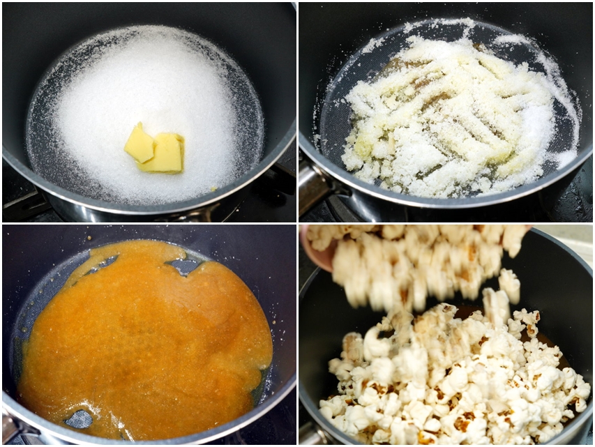 重點筆記: 如果沒有炒過糖的朋友,第一次糖融化後可以先直接關火、下爆米花攪拌,比較不會失敗,等熟練了之後,再來挑戰焦糖,也就是稍微把糖多炒一下,這時間大約在3~5分鐘內,如果炒過頭,焦糖就會苦掉喔!