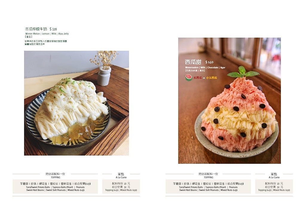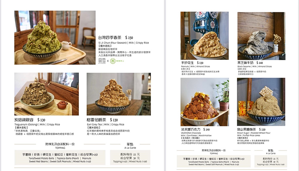 上圖是固定口味、下圖則是季節限定口味!固定口味目前有七種,不是一般冰店常見的口味、相當特別~每款冰品都會附煉乳和配料一份,配料有芋薯圓、珍珠、硬花生、蜜紅豆、蜜軟花生,以及綜合堅果可選擇。