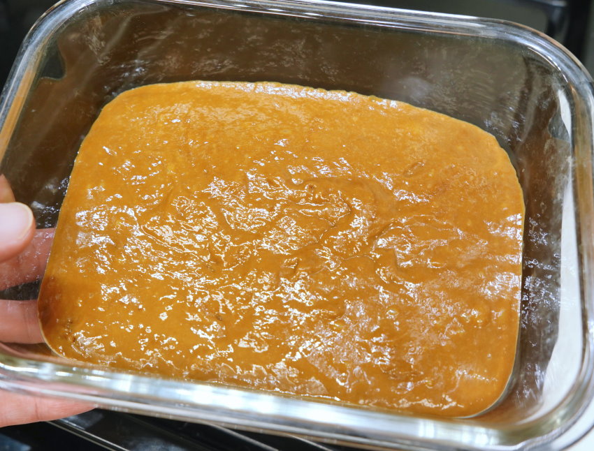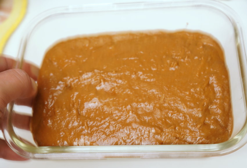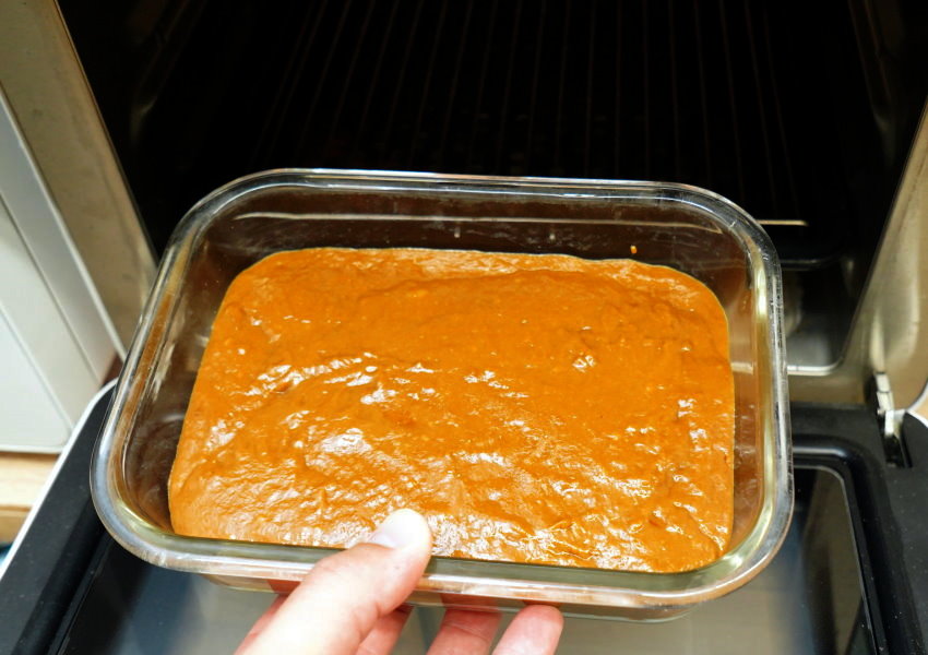 3.另外準備保鮮盒,底部放一張烘焙紙防沾黏,將發酵好的黑糖麵糊倒進去,稍微將空氣震出來即可放進蒸氣烘烤爐蒸個30分鐘(或用電鍋也行)。