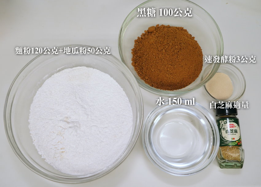 ▼黑糖糕所需食材如下,不過基本上Q度是靠地瓜粉或樹薯粉比例來增減,如果地瓜粉在相同比例下,麵粉要使用中筋或低筋麵粉都可以,比較喜愛Q韌口感的朋友可以選用高筋,但如果家裡有長輩、小朋友或是不喜歡過Q口感的朋友選用低筋、中筋即可!