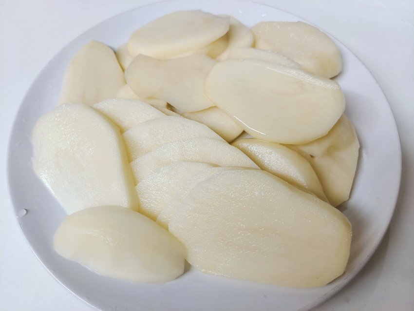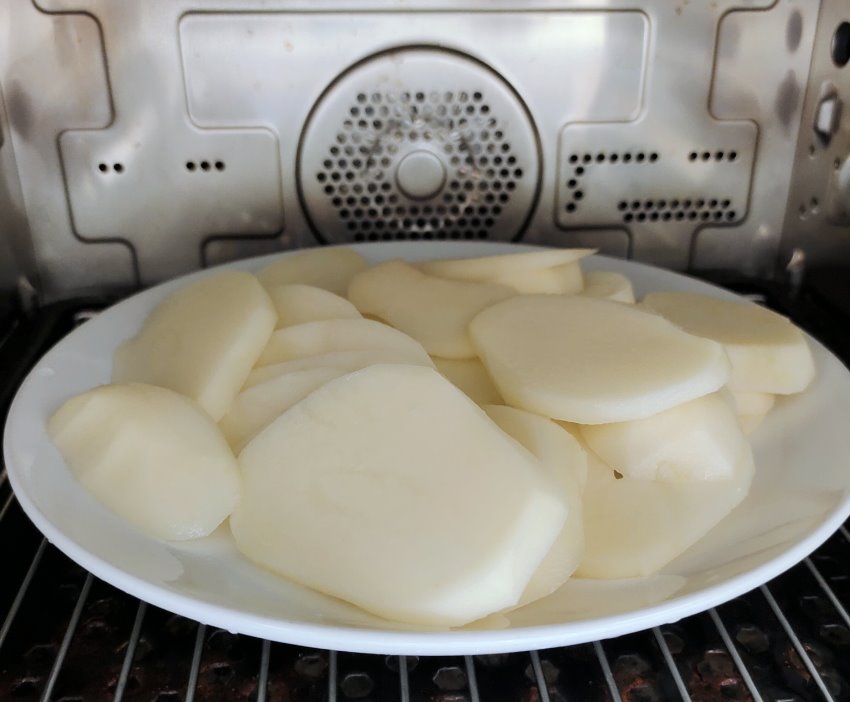 1.馬鈴薯洗淨後去皮切成薄片,再放進蒸氣烘烤爐(或電鍋)蒸20分鐘。