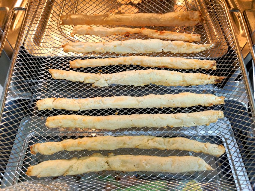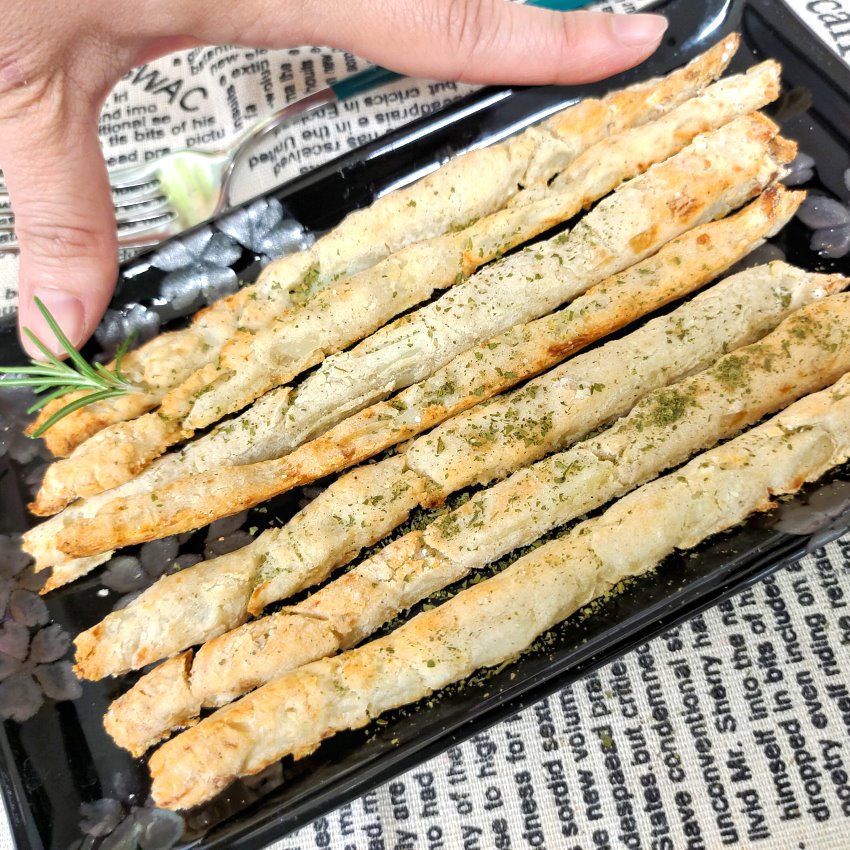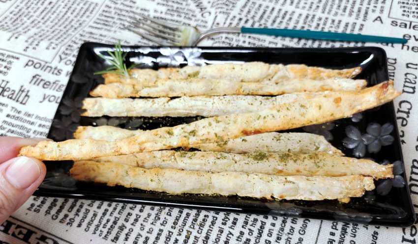 3.將馬鈴薯麵團放在烘焙紙上,上頭鋪上一層保鮮膜,用擀麵棍擀平約1公分的厚度,以刮刀切成0.5~1公分的長條狀,稍微整型一下就可以塗上一層橄欖油放進氣炸烤箱裡頭(也可用氣炸鍋、油鍋),設定200度15分鐘(喜歡酥脆的朋友可以多5分鐘)。