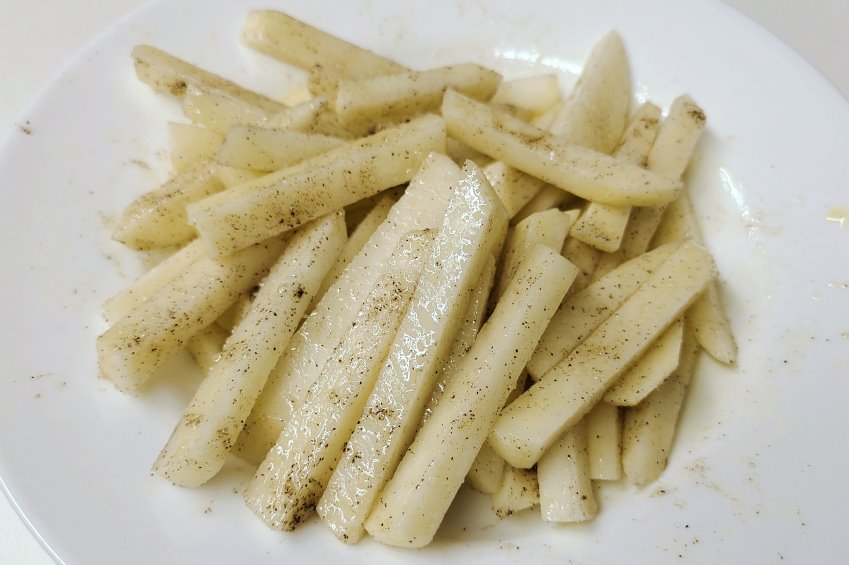 2.將薯條撈起後用紙巾擦乾,放至盤器上,依序加入橄欖油、鹽巴、黑胡椒粉,用手抓醃均勻。