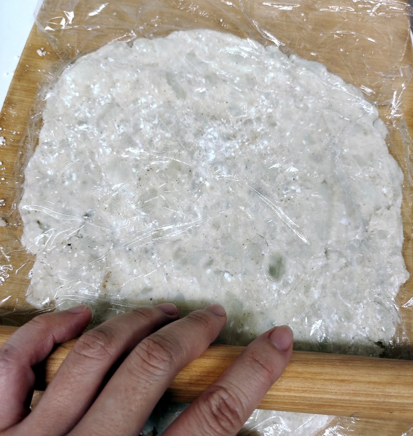 ▼將馬鈴薯麵團放在烘焙紙上,上頭鋪上一層保鮮膜,用擀麵棍擀平約1公分的厚度~~