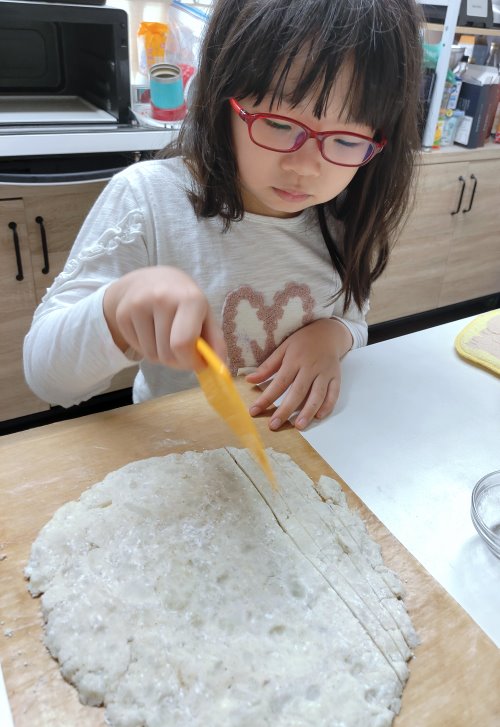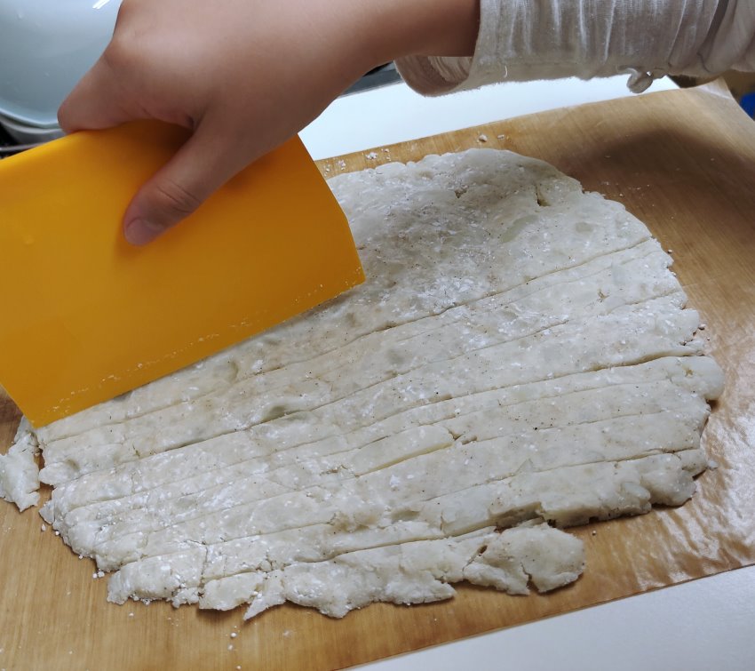 ▼再來以刮刀切成0.5~1公分的長條狀,就交給小口愛來處理啦~~長度可以依照個人喜愛決定,因為我們是用氣炸烤箱,所以長度就沒有做得特別長,大家想做到30公分以上也沒問題唷(笑)!