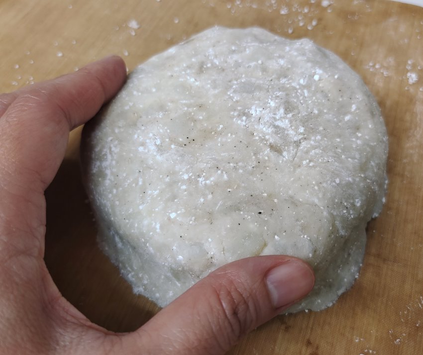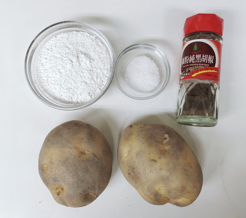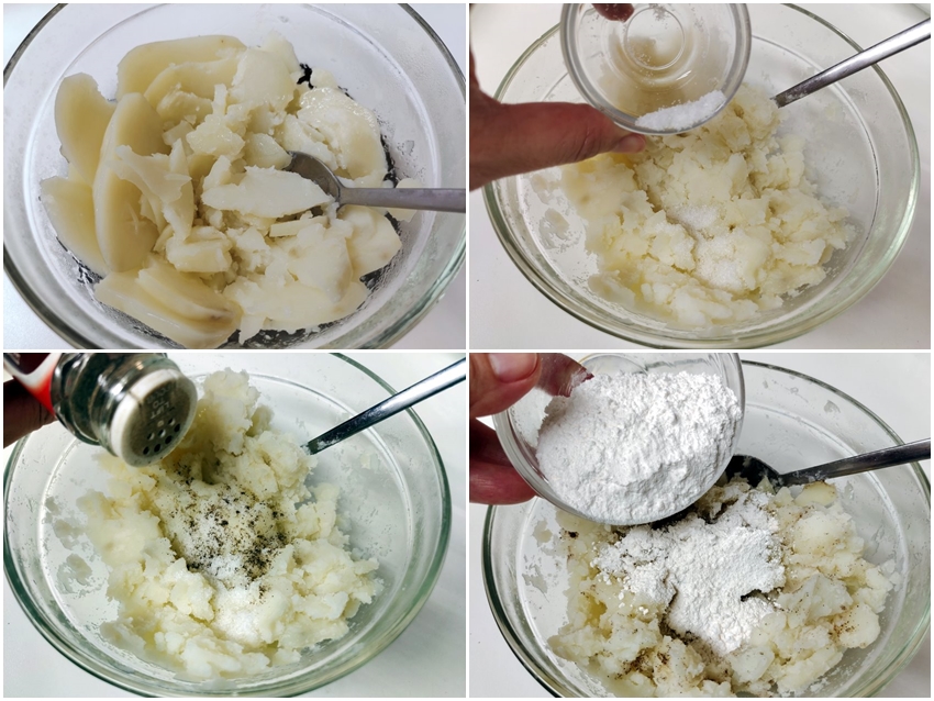 2.馬鈴薯蒸熟後趁熱搗成泥狀,再依序加入鹽巴、黑胡椒粉、樹薯粉,攪拌均勻後再捏成麵團狀。