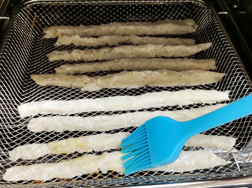 ▼將整形過的超長薯條放進氣炸烤箱的網籃裡頭,塗上一層橄欖油就可以準備氣炸囉!