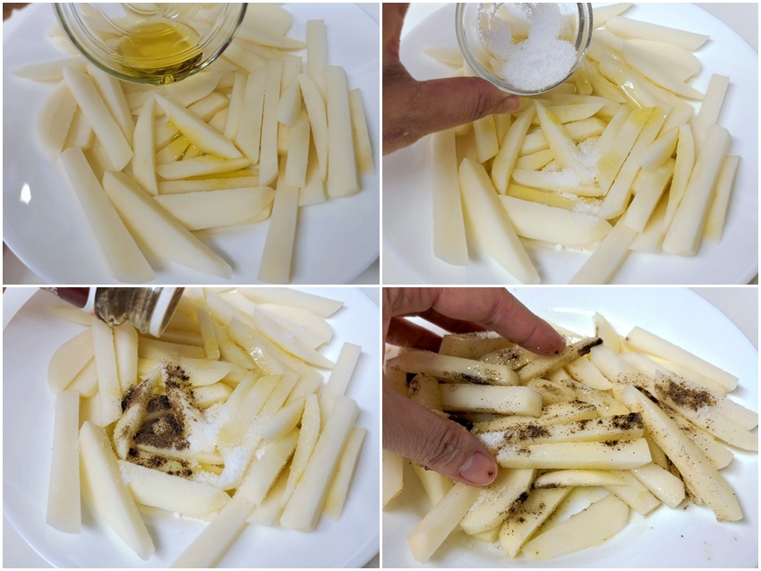 ▼擦乾後的薯條放至盤器上,依序加入橄欖油、鹽巴、黑胡椒粉,用手抓醃均勻;家裡有起司粉的朋友也可以額外加一些增添起司香氣~~有其他喜愛的調味料也可以加進去,因為我們是要給小朋友吃,所以就以最簡單的鹽巴、黑胡椒粉調味!