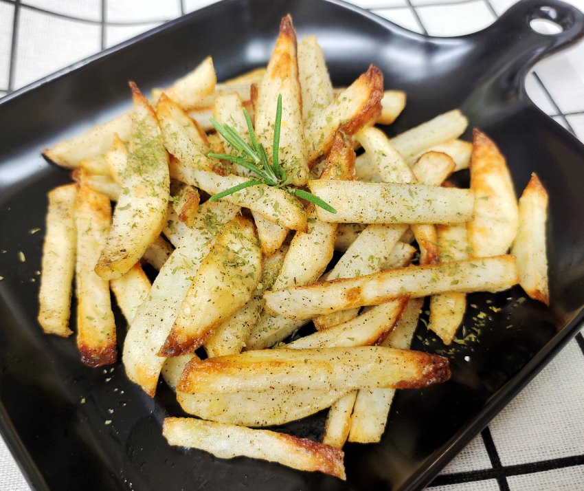 4.長薯條出爐後,撒上洋香菜葉、擺上迷迭香即可享用。
