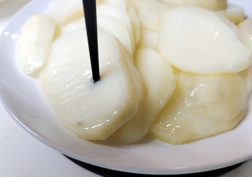 ▼蒸熟的馬鈴薯先用筷子插插看,如果很容易插入就代表已經熟透囉!