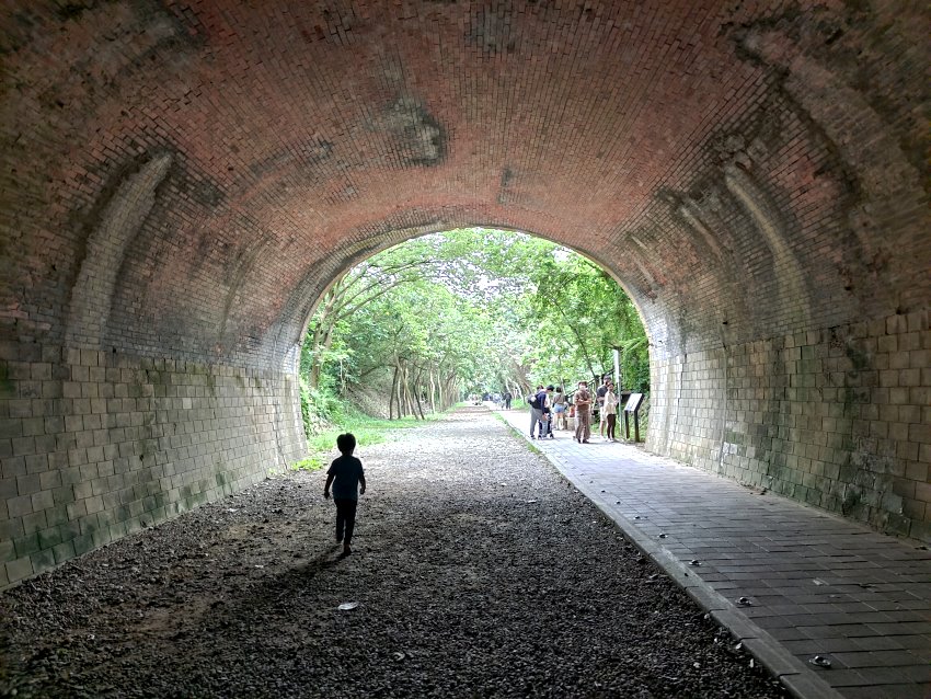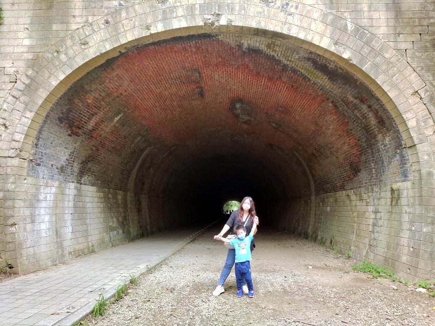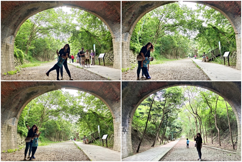 ▼小口弟沒多久就跑到洞口了~~可能覺得裡頭很暗,一直想往洞口跑(笑)!復古的隧道搭配綠意環繞,給人一種幽靜又美好的氛圍~~