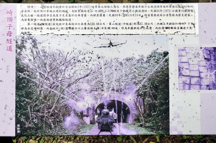 ▼「崎頂子母隧道」建於1928年,在1978年海岸線電氣化新線通車後就停用至今,於2005年經由苗栗縣政府公告登錄為苗栗縣歷史建築,後來才將隧道與附近環境整理成「崎頂隧道文化公園」,將北側入口處鋪設鐵軌、候車亭等,在兩隧道間還設有造型木橋,吸引不少朋友來訪!!
