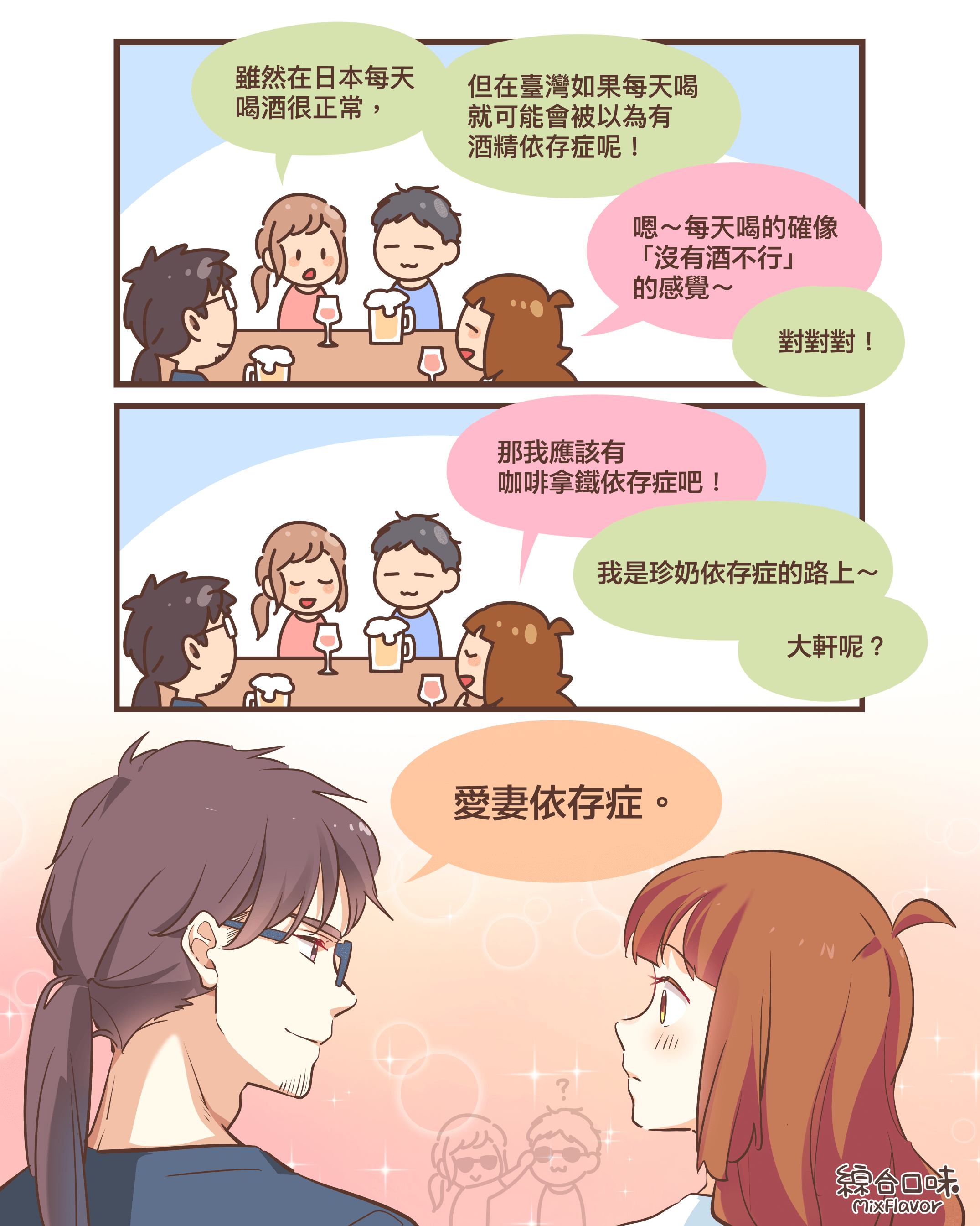 綜合口味 2022/05/30瀏覽: views 某天跟西卡和太郎在居酒屋發生的真實故事XD 「依存症(いぞんしょう)」其實就是中文的「成癮症」。 如字面上的意思,指的是過度依賴某種事物所產生的精神疾病,而現代常出現的是「酒精依存症」、「手機依存症」、「賭博依存症」,日本甚至還有「小鋼珠依存症」~說起來小莓在考大學的時期曾經有精神飲料依存症呢 ⋯⋯ 話說當初大軒思考時間只有0.00001秒就回話,完全像是就在等西卡問這句 西卡的心情大概就像在打麻將時,不小心餵了一張很甜的牌給大軒吃一樣後悔吧 原文出處:綜合口味 Related Items家庭生活 親子家庭兩性 2022/05/30瀏覽: views 綜合口味 喜歡以輕鬆治癒的畫風,將日常中的酸甜苦辣化為可愛有趣的故事!秉持著「世間沒有萌不起來的東西」信念,持續創作中! Related Items家庭生活 next page