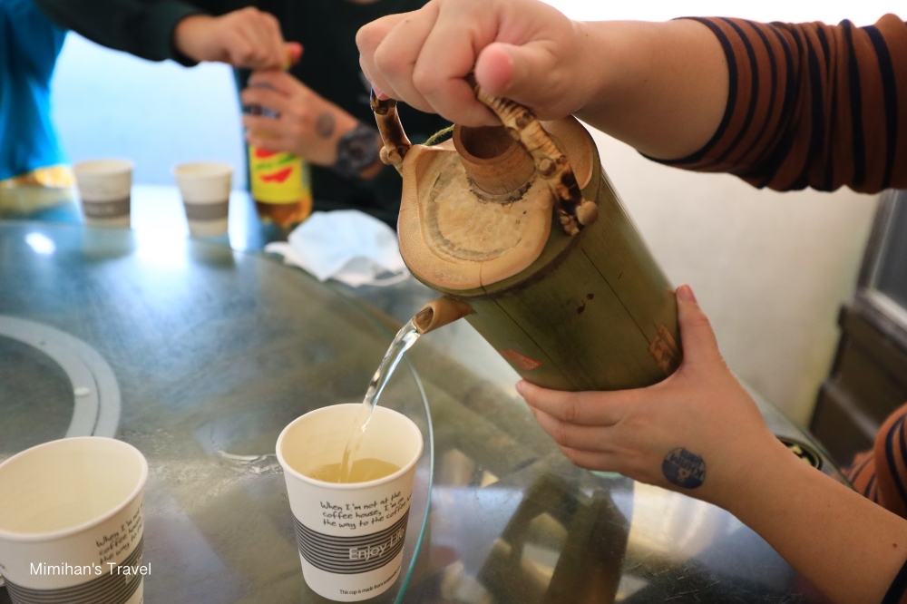 桌上有熱茶,還用竹子做的水壺裝很特別~