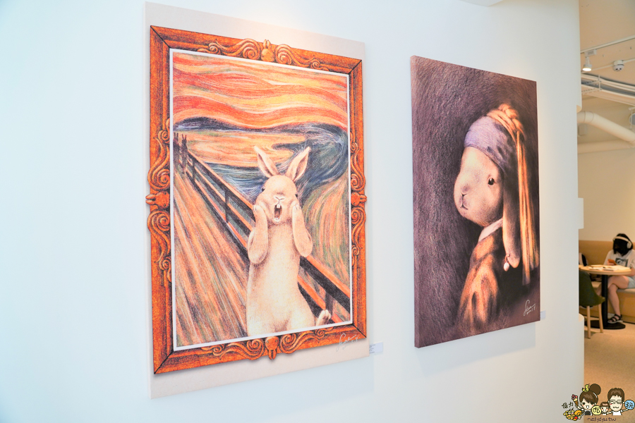 牆面上也許多畫作,像是日本奈良美智以及高雄在地藝術家 面具兔 作品