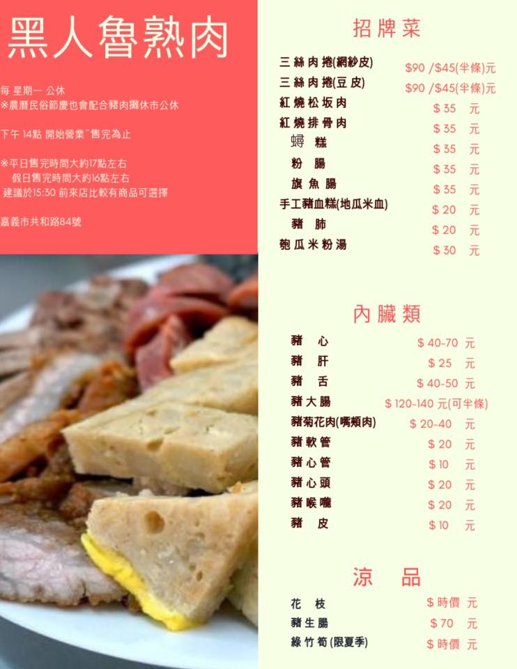 來到嘉義,大口推薦一定要來吃吃看魯熟肉,因為這一味才是正統嘉義在地的古早味下午茶啊! 魯熟肉其實就是俗稱的「黑白切」,也就是台南稱的「香腸熟肉」,只不過嘉義的魯熟肉多了不少內臟類的食材,畫龍點睛的沾醬也跟台南的不太一樣!一向熱愛香腸熟肉的大口一定不能放過這款美味,這次品嚐的「黑人魯熟肉」可是間六十年的老店,老闆每天採用新鮮溫體豬肉製成各項產品,就是為了讓客人吃到最新鮮的美味!接下來趕緊帶大家來去看看「黑人魯熟肉」有哪些厲害的餐點吧!