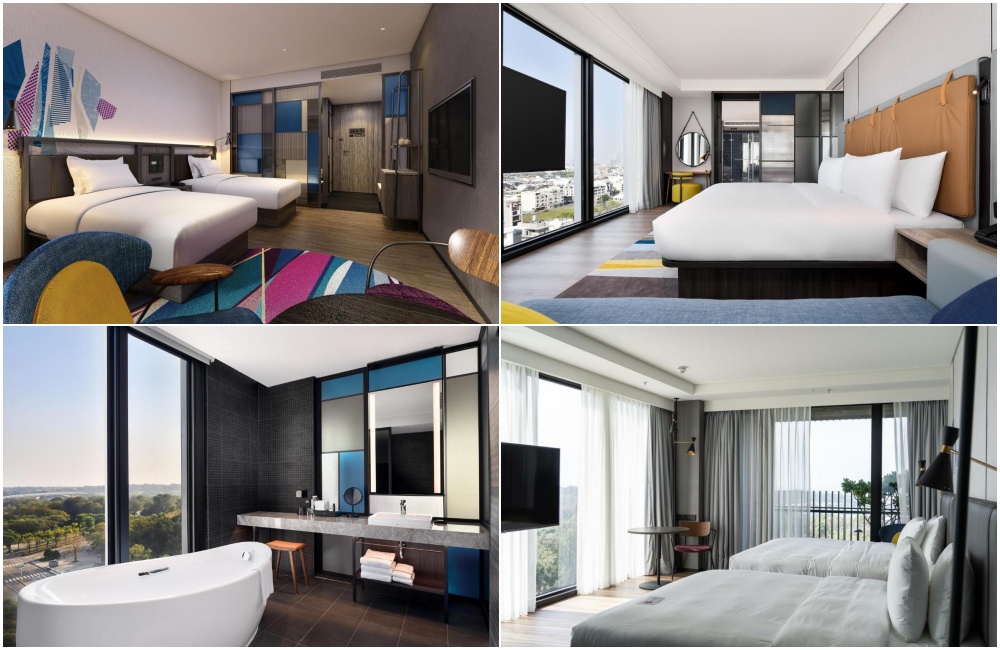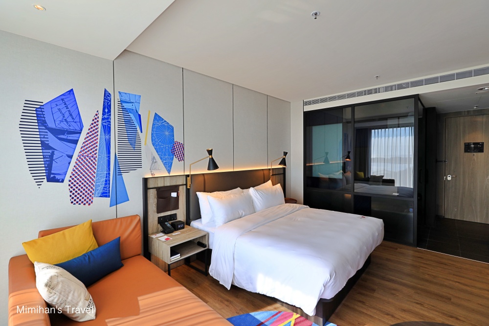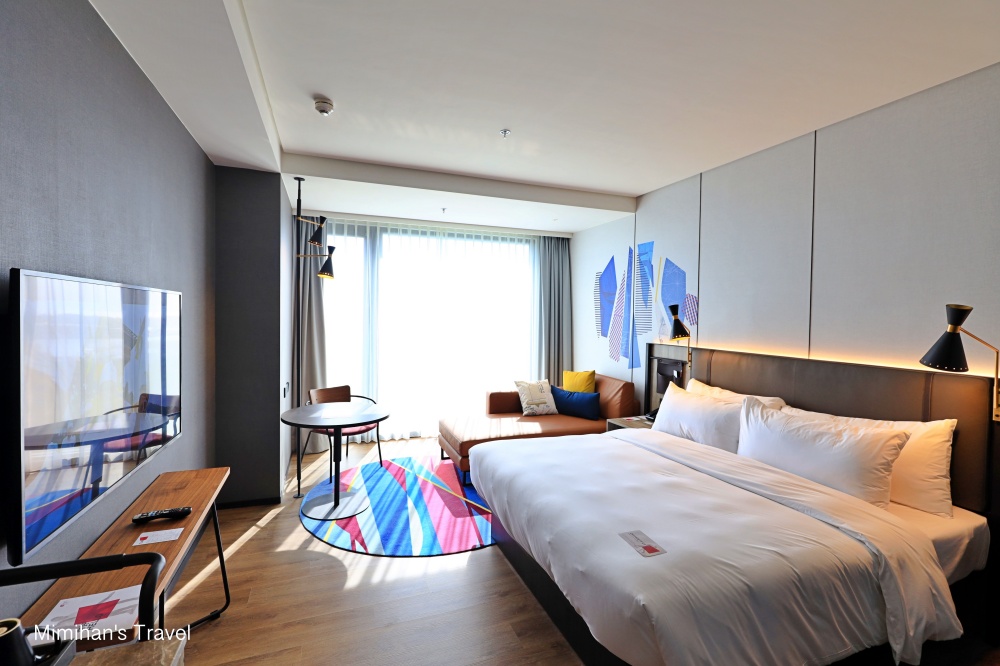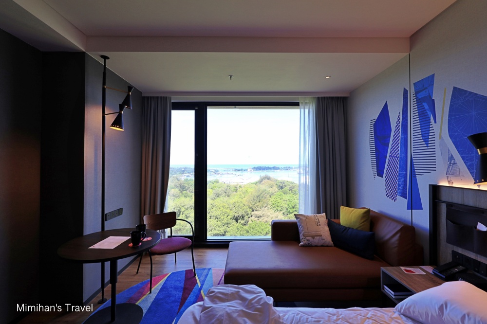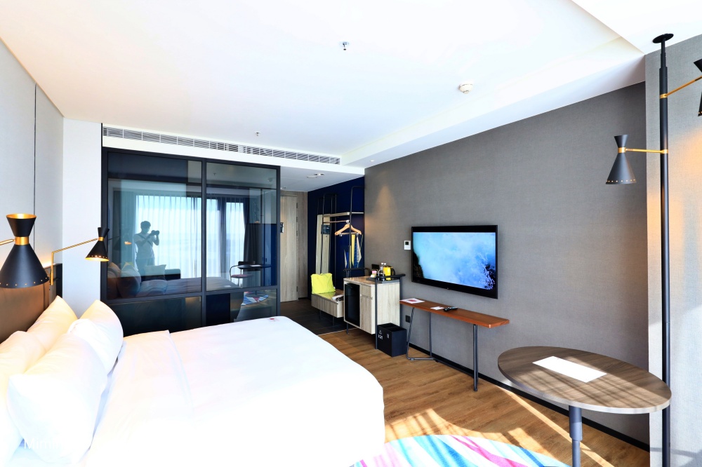 台南安平雅樂軒酒店共有115間客房,每間都是海景房,其中還有部分擁有兩面開窗的視野,躺在床上就可以欣賞到公園海景。