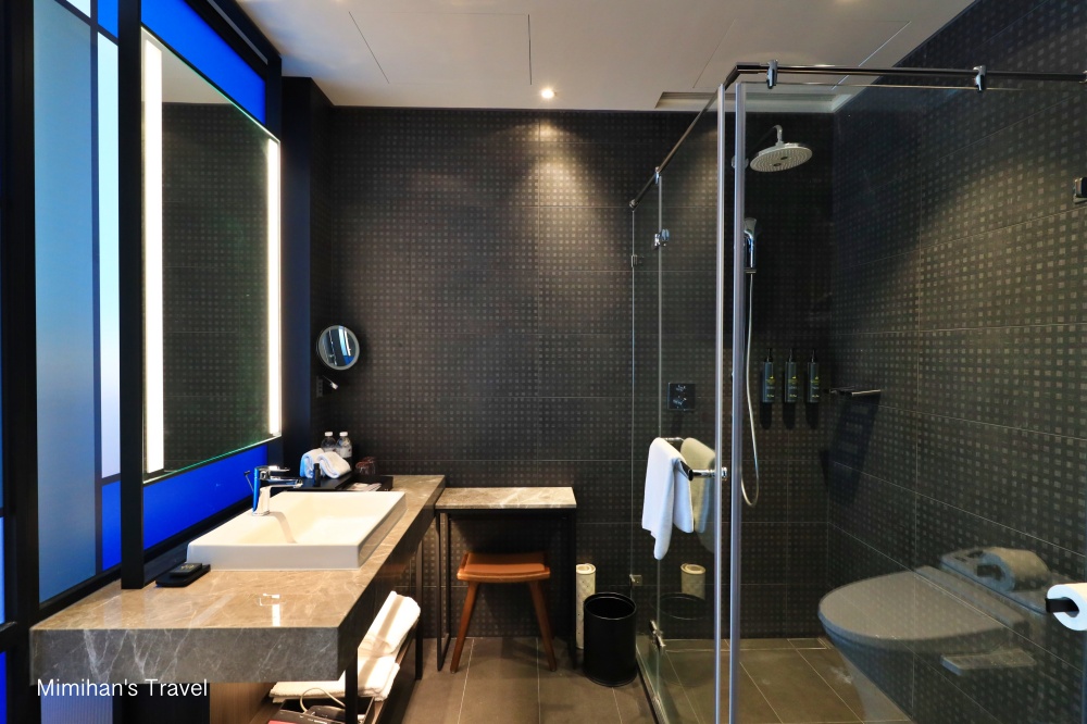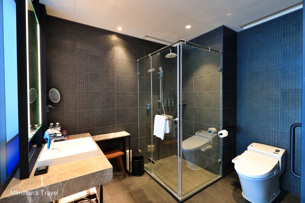 乾濕分離的衛浴空間蠻寬敞,配備單槽洗臉盆、並使用免治馬桶,淋浴水量充足洗澡挺舒服,還放了個小椅子方便女生在這裡化妝或做保養。