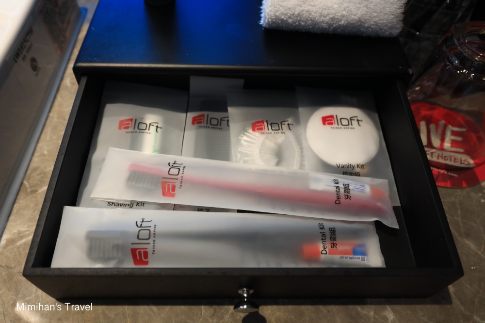 牙膏牙刷、浴帽、梳子、化妝組⋯各種衛生備品都準備蠻齊全,還貼心放了兩瓶礦泉水。