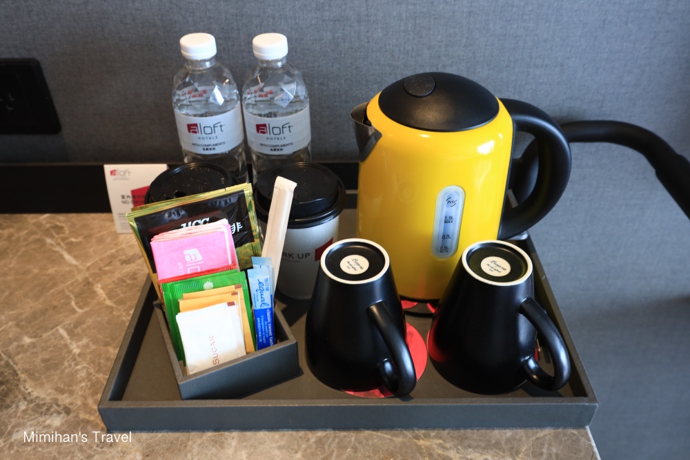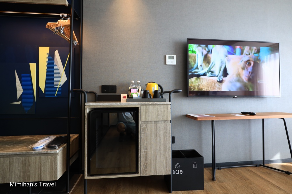 玄關進來是個開放式衣架置物區,還有個包含冰箱的Mini Bar,準備有咖啡茶包、礦泉水和快煮壺等備品,還提供空的紙咖啡杯可以到一樓去裝咖啡來享用。不過冰箱裡沒有飲料這點,就有網友認為說這樣太小氣惹~