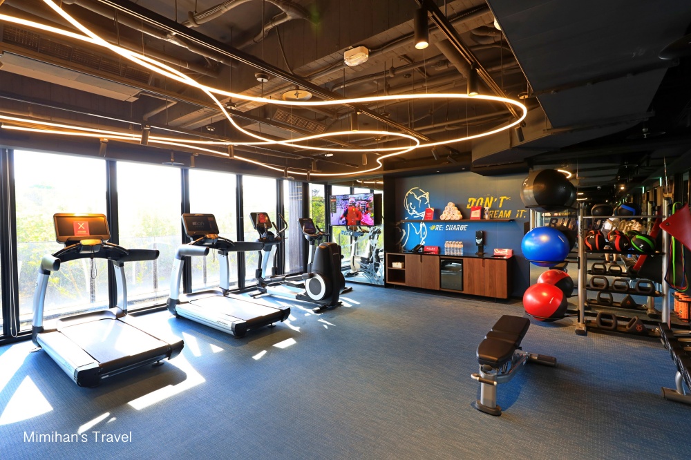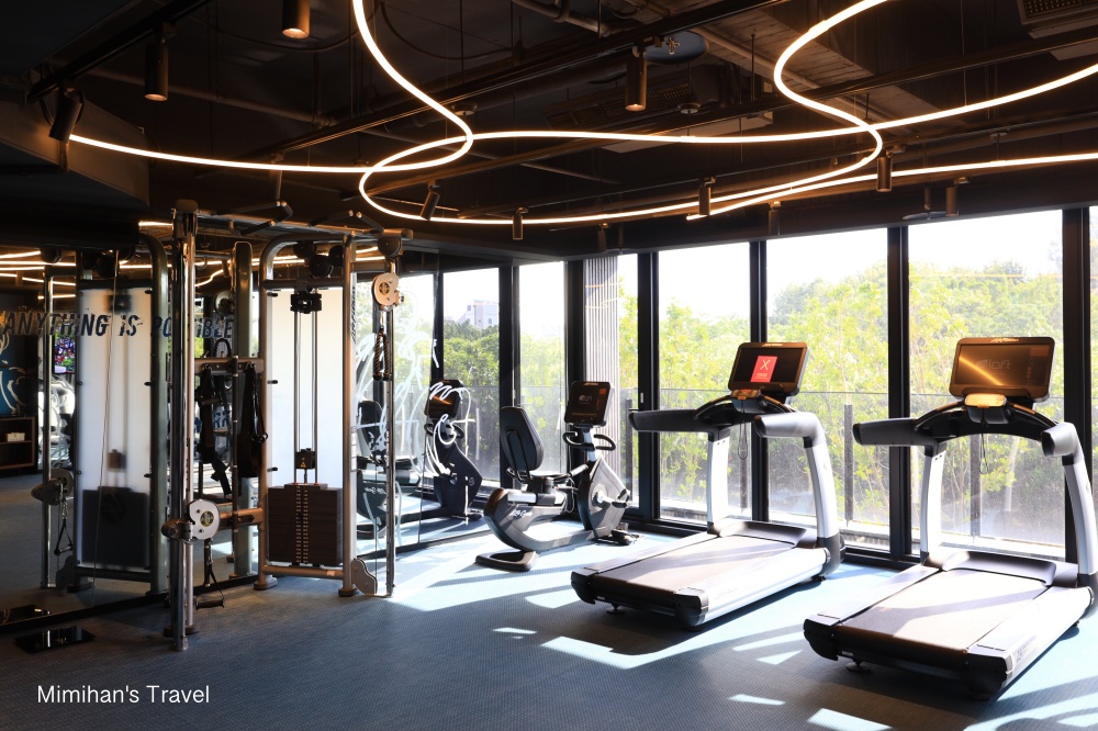 安平雅樂軒的健身房也還不錯,用的跑步機、踏步機和腳踏車都是比較先進機種;還有啞鈴壺鈴、健身椅和複合式重訓器材等設施,也有準備毛巾飲用水。那個打X的不是壞掉,是說保持安全距離所以先不能使用,我是感覺這樣好像沒啥意義就是了。