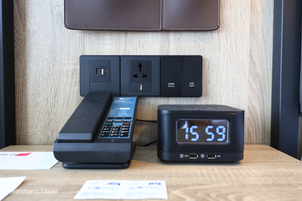還有就是房間裡插座很多,床的兩側、餐桌旁邊都有插座和USB、Type-C插槽,在哪都可以輕鬆充電。床邊還有個可以讓手機無線充電的藍芽音響。