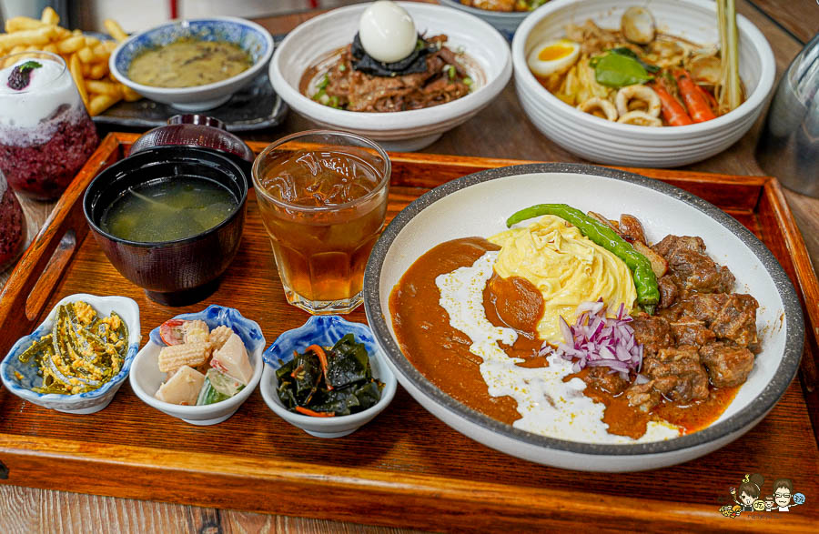 黃金比例特製咖哩加入大量的小農水果製作,升級套餐還搭配三樣小菜、無糖茶飲
