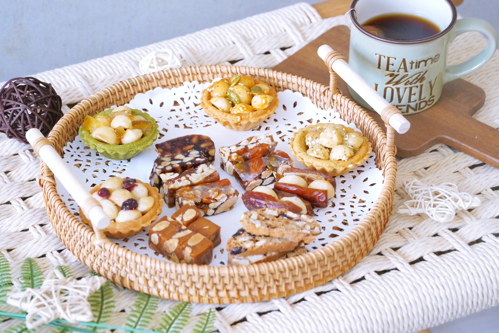 ▼內容物:椒香豆塔 5 入、夏威夷豆塔 5 入、夏威夷潛艇(S) 200g、南棗核桃糕(S) 260g