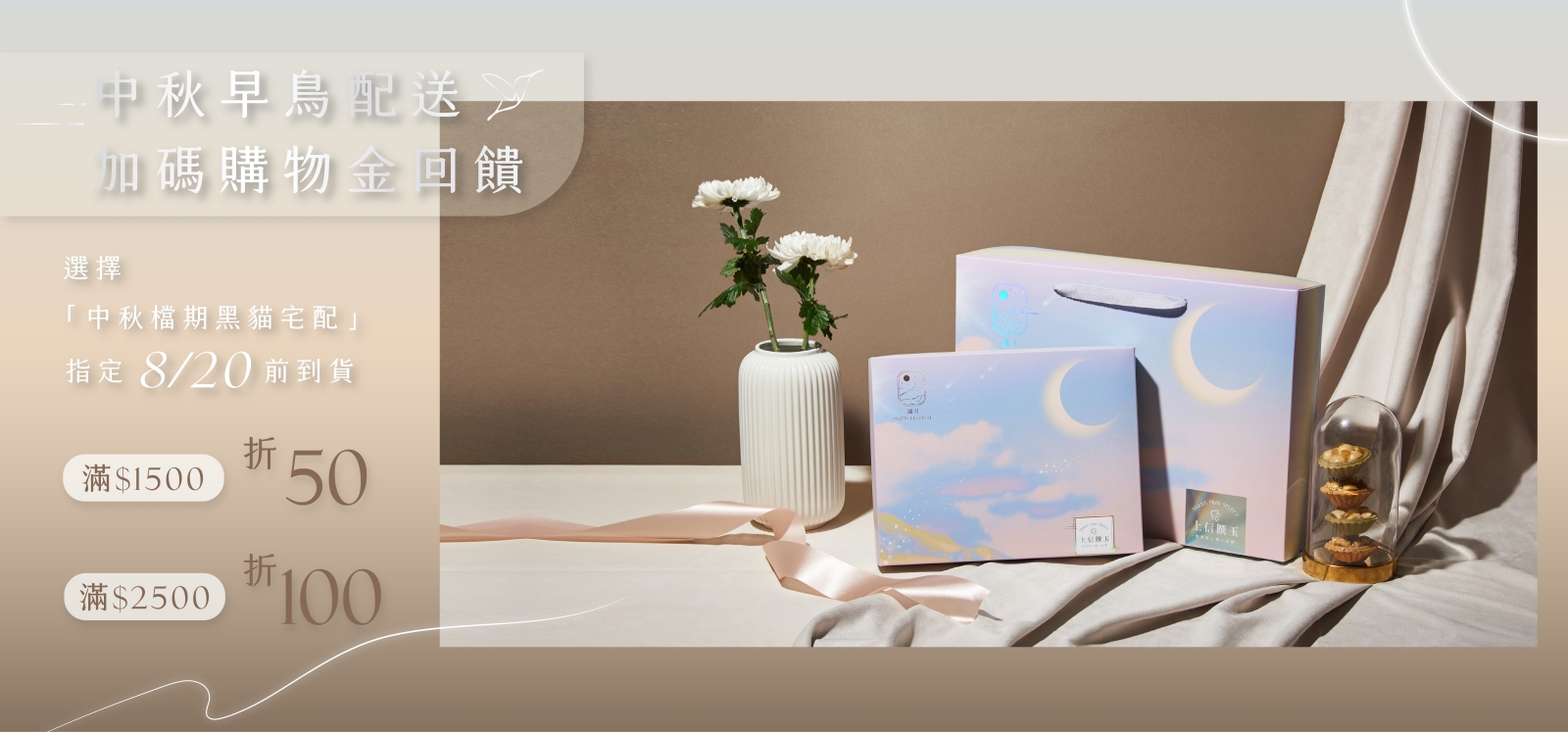 1.即日起至「官網」下訂,並在結帳時選擇「中秋檔期黑貓宅配-早鳥配送優惠」指定 8/20 前到貨,就能享有訂單滿 $1500 折 50、滿 $2500 折100的優惠!(折扣以$100 為限,不得累積)