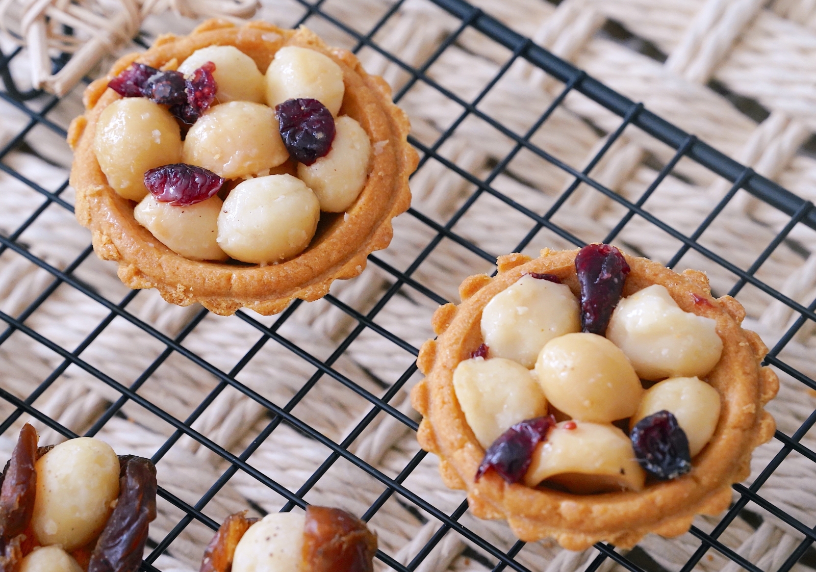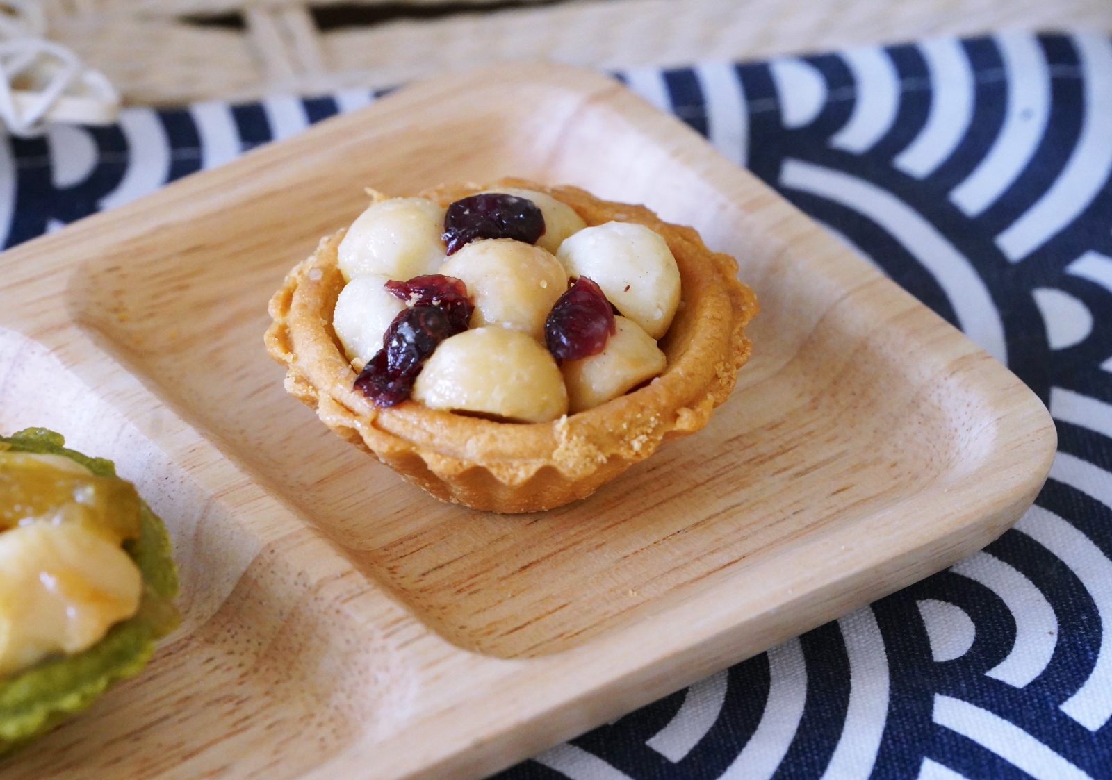 飽滿夏威夷豆緊密的湊合在塔皮內,每顆夏威夷豆都受到溫度與時間精準掌控,烘焙出果仁香氣,夏威夷豆有淡淡奶油味,調味成甜鹹皆宜,用蔓越梅果乾搭襯,美化外觀,也加乘口感與風味。塔皮添加法國依思尼奶油,讓塔皮鬆香之外,也因為添加依思尼奶油,給人無壓的輕盈感,非濃又嗆的加工物味。