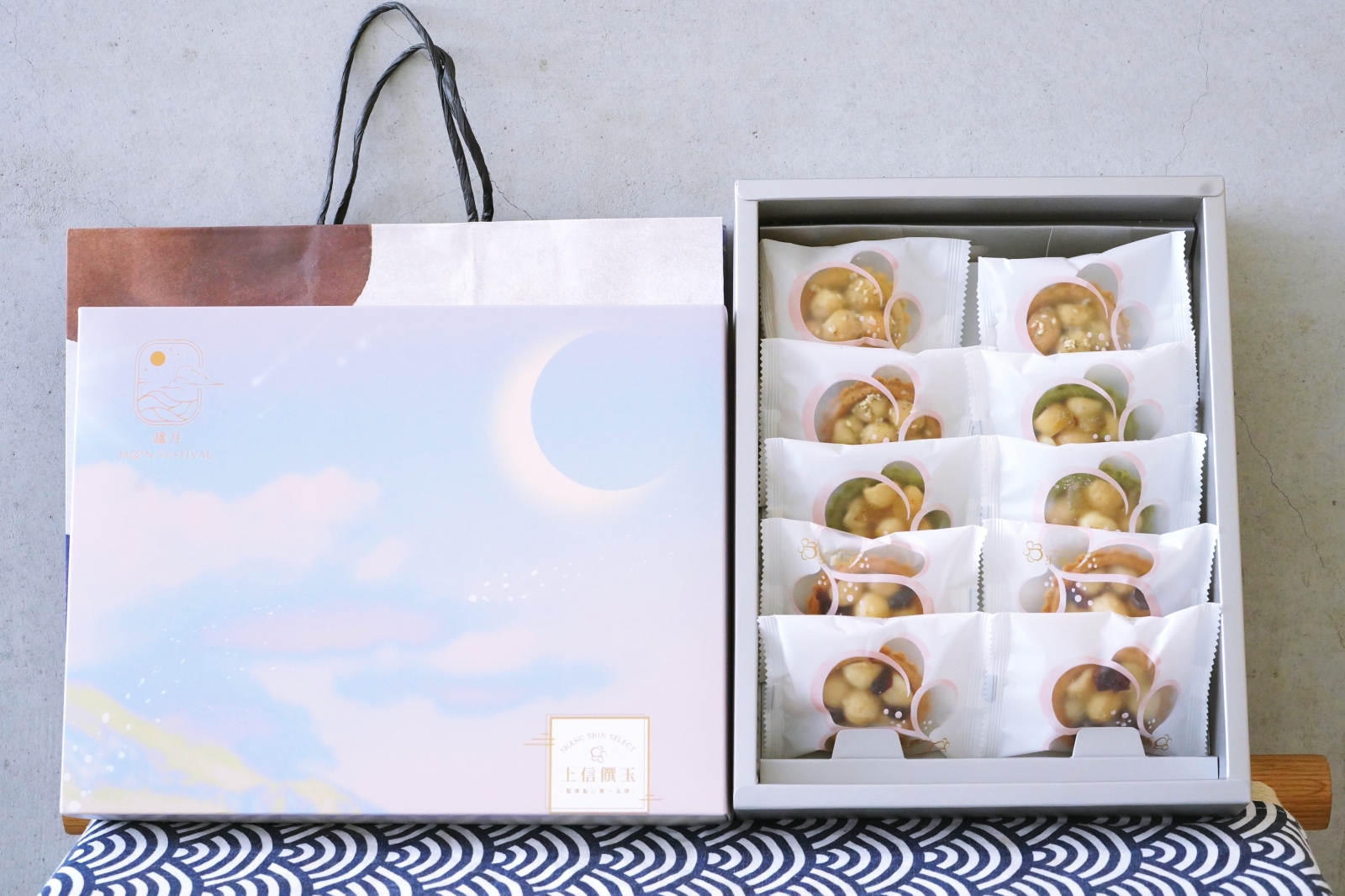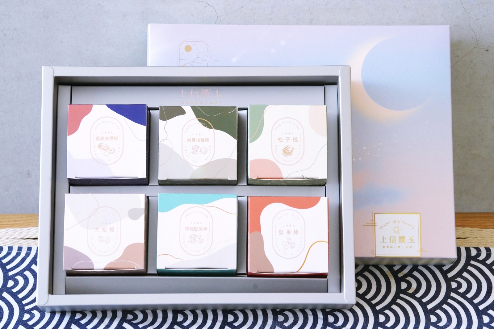 ▼上信饌玉 2022 年推出 8 款謐月系列中秋禮盒,期間限定販售。這次開箱其中 6 盒,是常態販售的產品做不同的搭配,特別設計出中秋禮盒包裝,並一併推出新產品「海苔豆塔」、「柚香豆塔」納入中秋禮盒包裝。幾乎每次推出年節禮盒時,都會有新品推出,愛嘗鮮的人可以把握促銷。