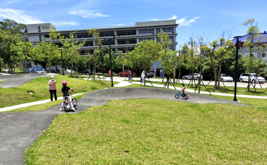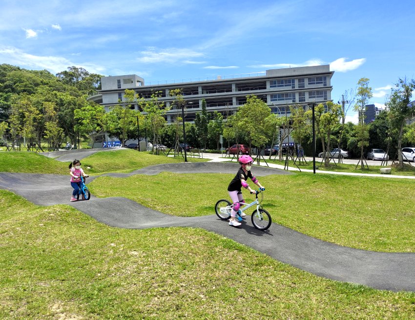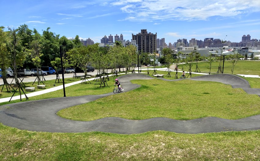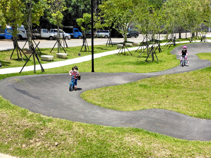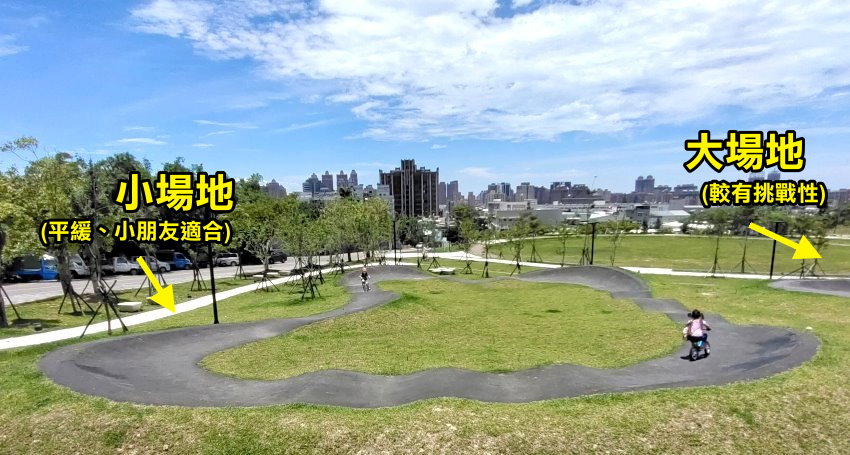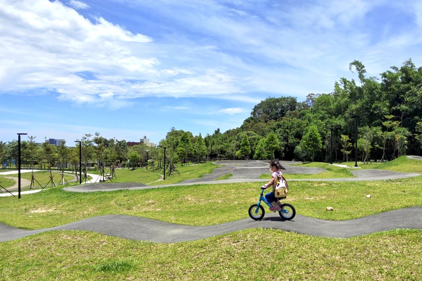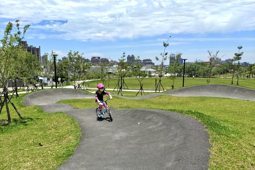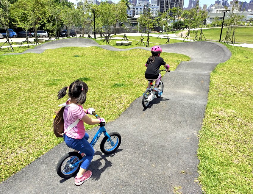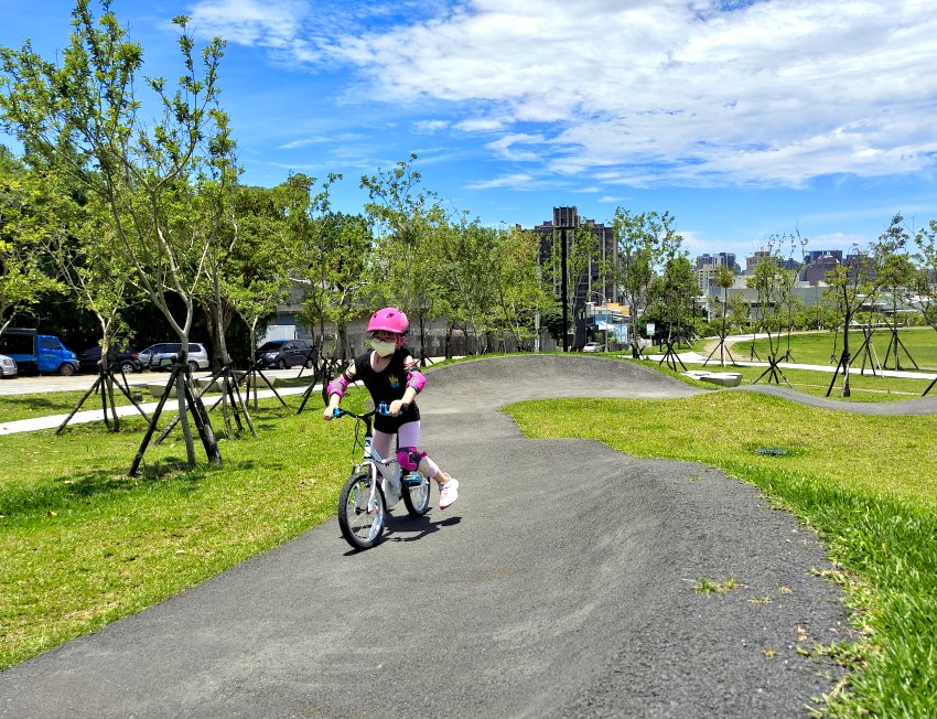 極限運動愛好者有福啦!位於桃園區健行路、大有路交叉路口附近的「汴洲公園」於去年整修部份空間,打造成桃園首座Pump Track場地,是專為自行車、滑板所打造的極限運動場,一旁也有立體停車場,就算開車前來也不用擔心沒位子停,附近還有大有梯田生態公園,都可以一起順遊!在這裡不管是腳踏車、兒童滑步車、直排輪、滑板等都可以進場玩耍,甚至還有台中的朋友特地帶小朋友來騎腳踏車呢~~目前共有三個大小場地,跑道包含了斜坡、波浪、山丘等設計,刺激又好玩, 一旁還有體健設施、磨石子溜滑梯、繁櫻步道等,很適合親子一起來同樂!