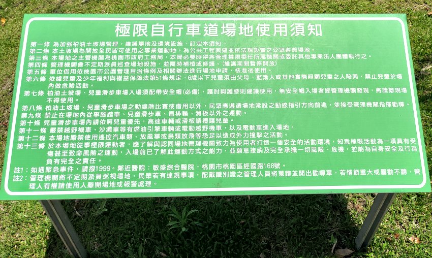 ▼極限自行車道場地使用須知,大家記得先看一下,務必遵守規定才能玩得安全又刺激!基本上這裡可以從事腳踏車、兒童滑步車、直排輪、滑板等運動,有動力或燃油車種一律禁止入內,且記得要戴安全帽與護具以免受傷唷!