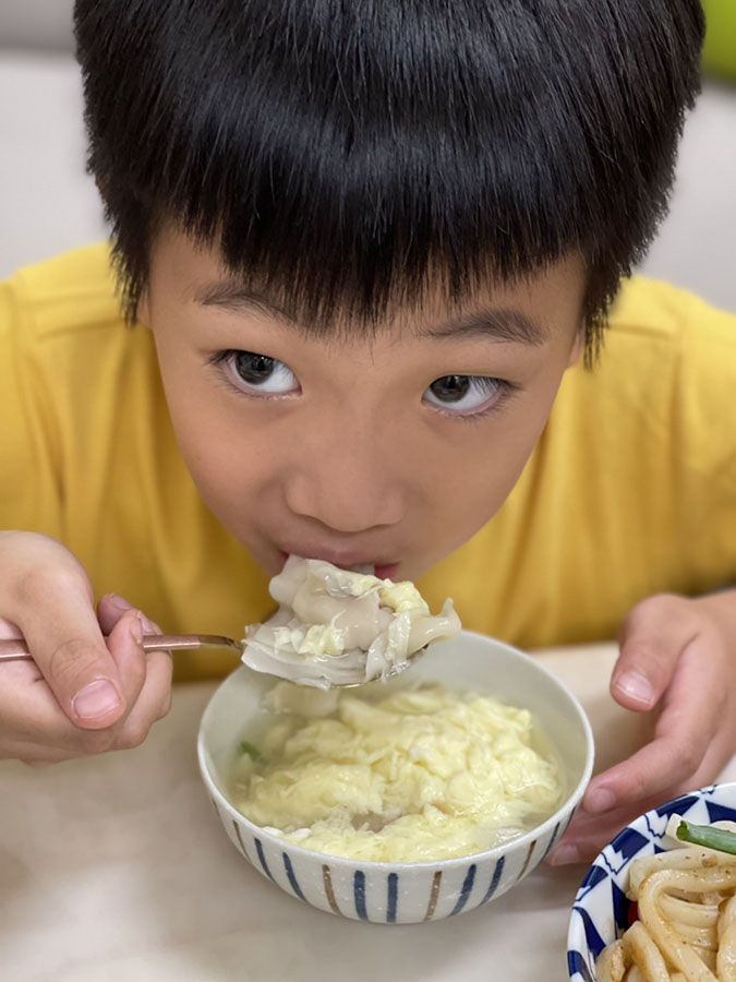 可以咀嚼到飽滿內餡鹹香滋味湧上來,孩子也說好好吃的餛飩