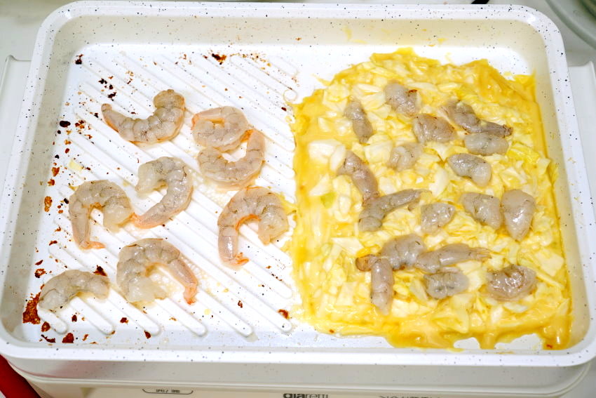 ▼切成小塊的蝦仁可以混入麵糊中一起下去香煎,我們是為了好看所以直接鋪在上頭~~如果擔心整隻蝦仁不容易熟透的話,也可以先放旁邊香煎,到時候再一起放上去即可!