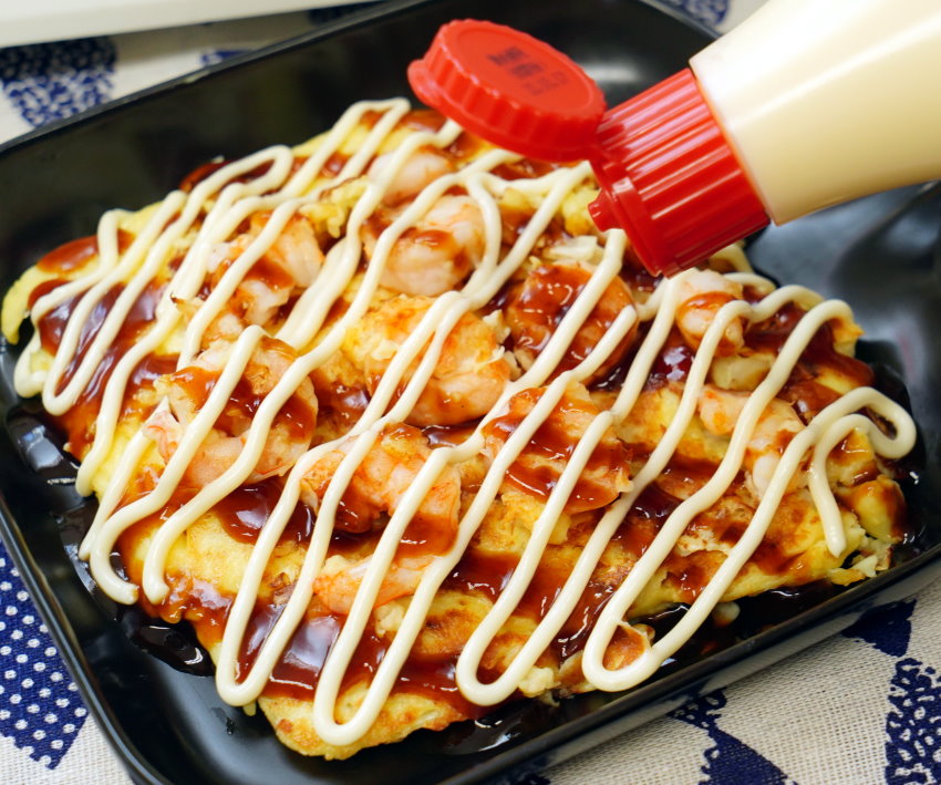 5.將蝦仁放在煎熟的麵糊上頭,再淋上大阪燒醬、日式美乃滋,並加上海苔粉、蔥花、柴魚片就完成了。